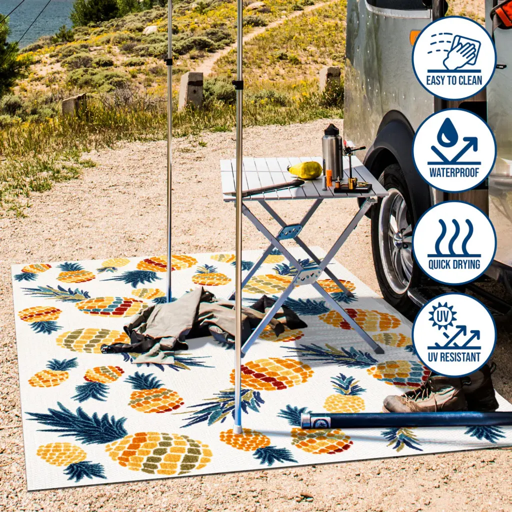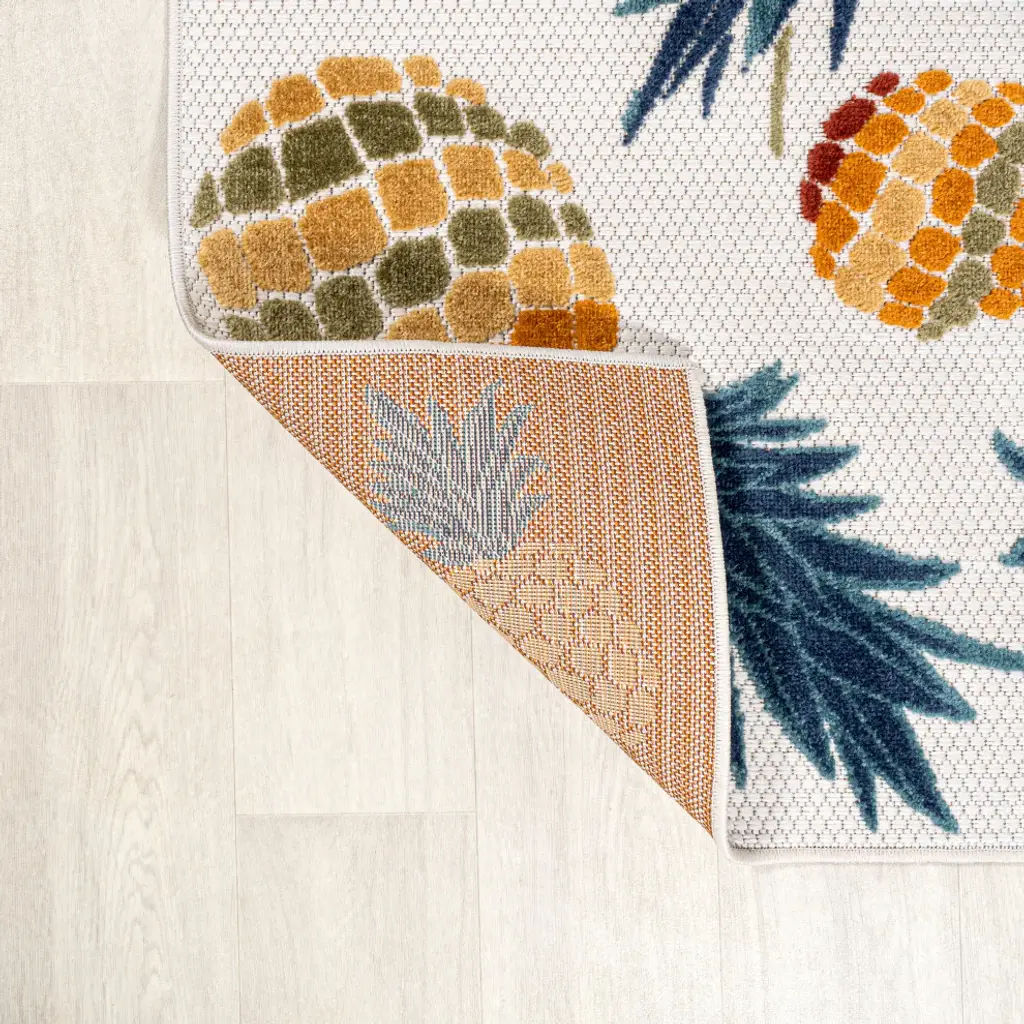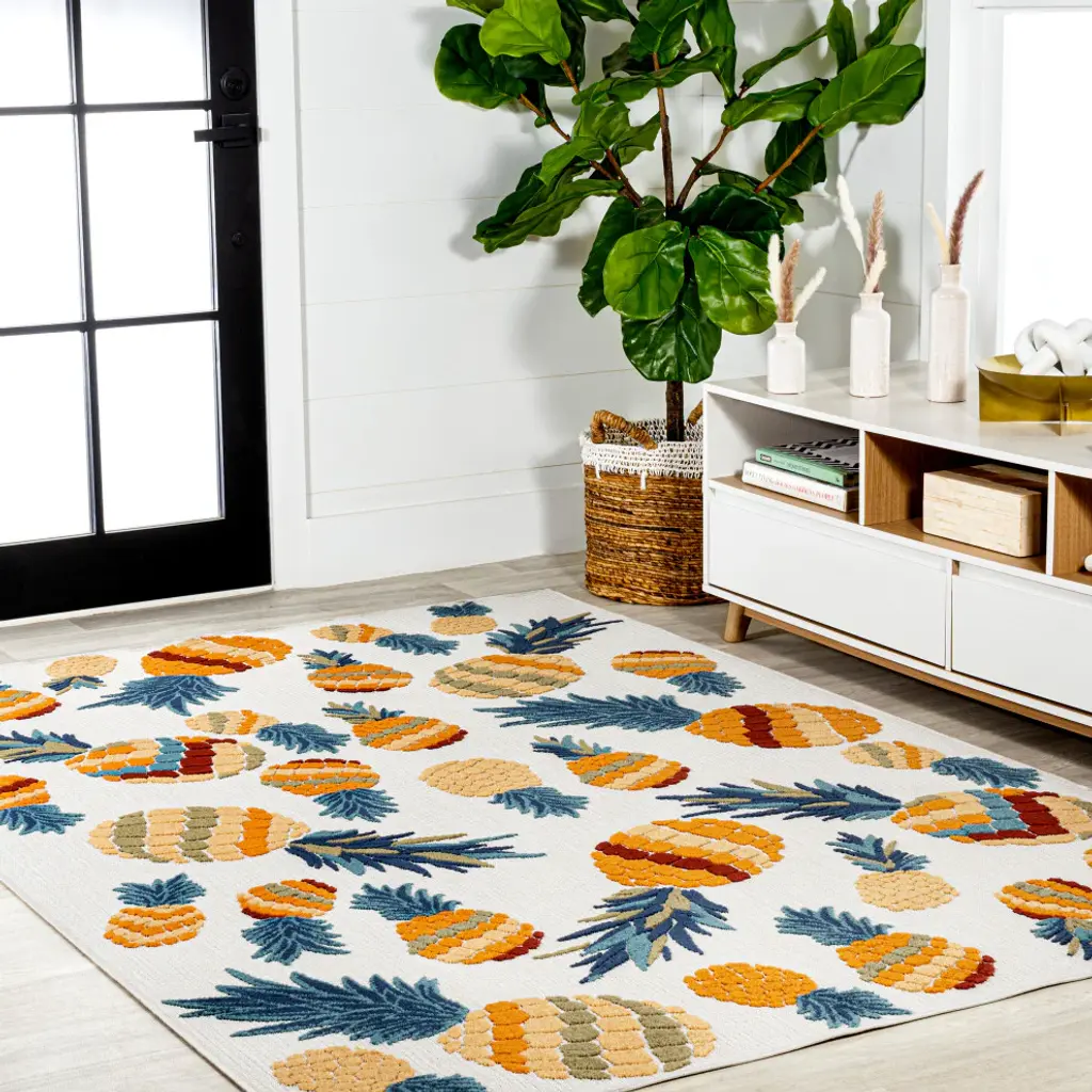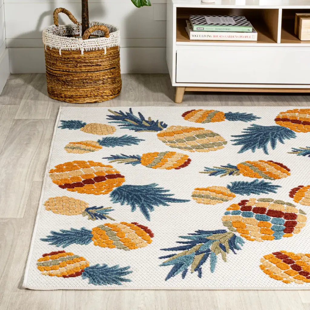 Add a tropical touch with our modern take on a graphic pineapple design. Our graphic rug will add a bold pop of pattern and color to the living room, dining room, bedroom or office. Perfect for the porch, this pet-friendly and low-pile design is easy to clean.Features:• Power loomed from durable synthetic fibers, with a short 0.2" pile • Jewel tones of teal blue, orange, green and gold stand out against an ivory background• Made from easy-care polypropylene - just sweep, vacuum or hose down with mild soap and water• 100% Polypropylene• No backing, use of rug pad is recommended (sold separately)• Power Loomed in Turkey• Actual Dimension: 4 ft. x 6 ft.• Color: Orange/Navy• Thickness measures: 0.2 in.• Available in multiple sizes and/or colorsRug Care:• Vacuum regularly and spot clean as needed; avoid direct and continuous exposure to sunlight; use brushless vacuum; remove spills immediately; if liquid, blot with clean, undyed cloth by pressing firmly around the spill to absorb as much as possible; for hard to remove stains, professional rug cleaning is recommended; store in a dry, well ventilated area and rotate for consistent wear• Packing and shipping may cause temporary creases in rugs, which will flatten out after a week on the floor; to expedite the process, try back-rolling your rug before laying it down, and then allow ample time for the remaining creases to relax• Please Note: Due to differences in monitors, some rug colors may vary slightly. Lengths and widths may vary from the published dimensions. Patterns may vary slightly according to shape and size selected.About us:Style your floors with JONATHAN Y. By combining fine craftsmanship and design, this New York creative studio is bringing fashion to your floors. The collection mixes sustainable organic materials, vibrant colors and trend worthy styles to create JONATHAN Y''s distinctive catalog of rugs.