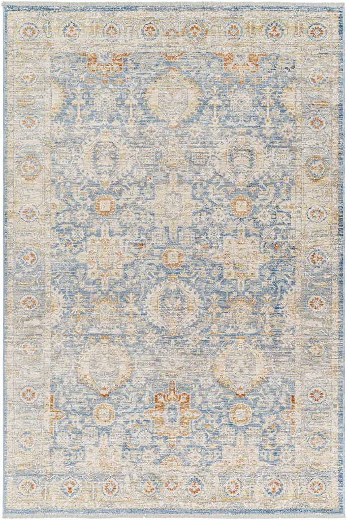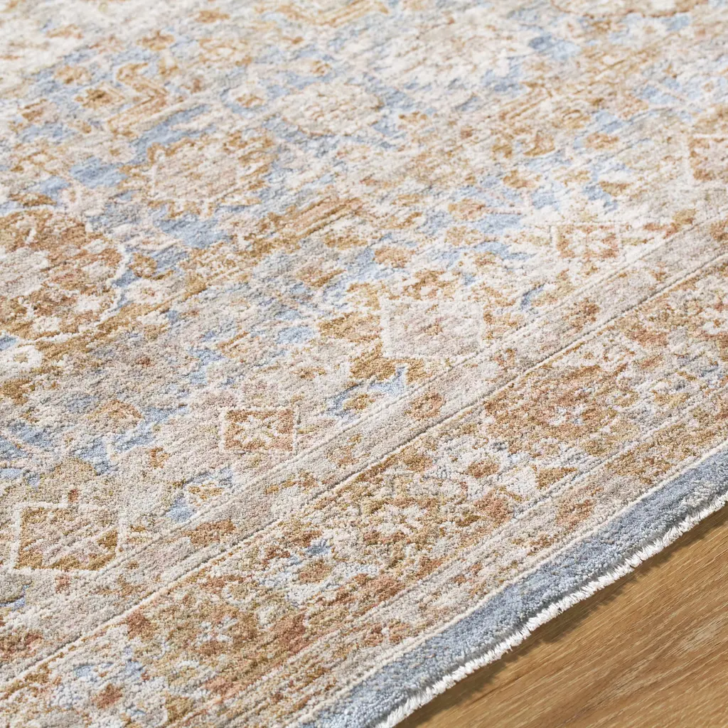Collection: Andres Colors: Cream, Tan, Sage, Blue, Light Brown Construction: Machine Woven Material: 100% Polyester Pile: Medium Pile Pile Height: 0.31" Styles: Traditional Made In: Turkey Thickness: 0.39" Price Range: $$$$$ (Affordable)