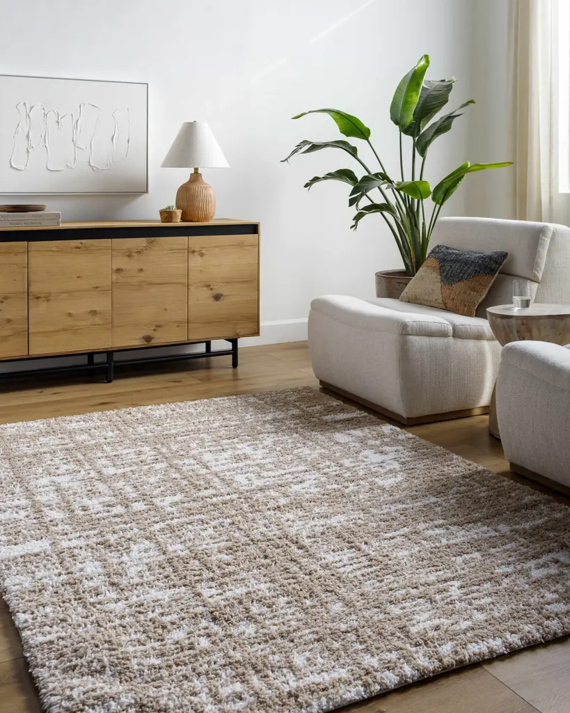 Collection: Anisha Colors: White, Tan Construction: Machine Woven Material: 100% Polyester Pile: Plush Pile Pile Height: 1.38" Styles: Contemporary Made In: Turkey Thickness: 1.57" Price Range: $$$$$ (Most Affordable)