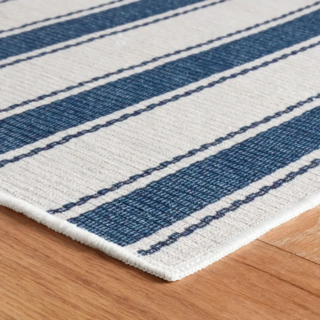 Part of our best-in-class collection of design-focused, machine-washable rugs. Make waves with bold stripes in coastal classic blue and white. Reminiscent of summer but suited for use year-round in any space that needs an easy-to-clean, eye-catching rug. Perfect for high-traffic spaces and homes with pets and kids. Its superior quality means it lies flat and remains soft underfoot, with no pilling or shedding, even after multiple washes.