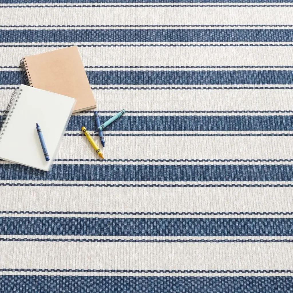 Part of our best-in-class collection of design-focused, machine-washable rugs. Make waves with bold stripes in coastal classic blue and white. Reminiscent of summer but suited for use year-round in any space that needs an easy-to-clean, eye-catching rug. Perfect for high-traffic spaces and homes with pets and kids. Its superior quality means it lies flat and remains soft underfoot, with no pilling or shedding, even after multiple washes.