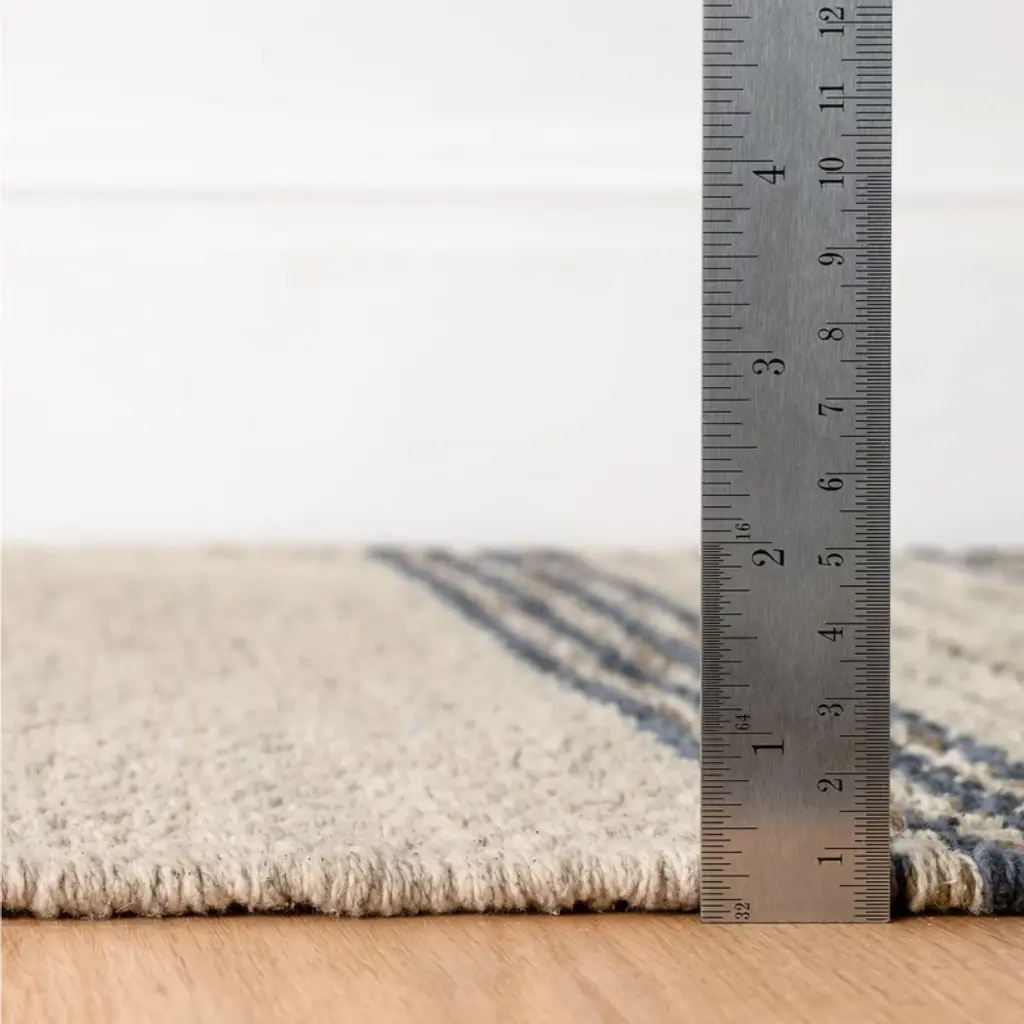 This lightweight yet durable cotton rug features navy and olive stripes on a neutral background. Made with our signature flatwoven construction, it provides softness and versatility. Guaranteed to add effortless style to your space.