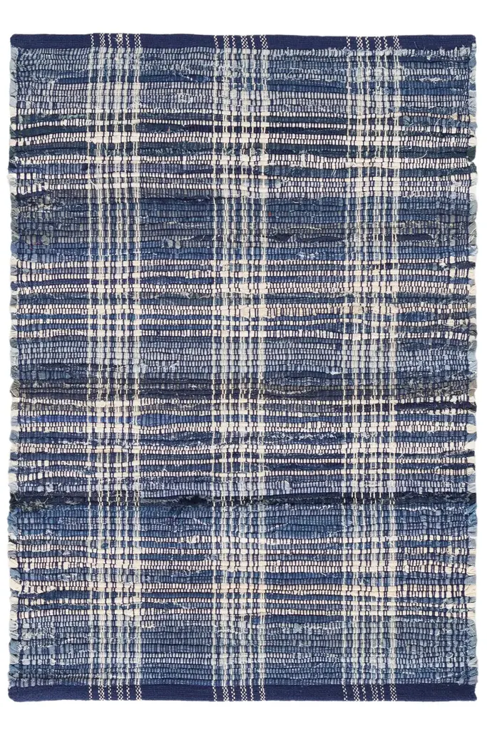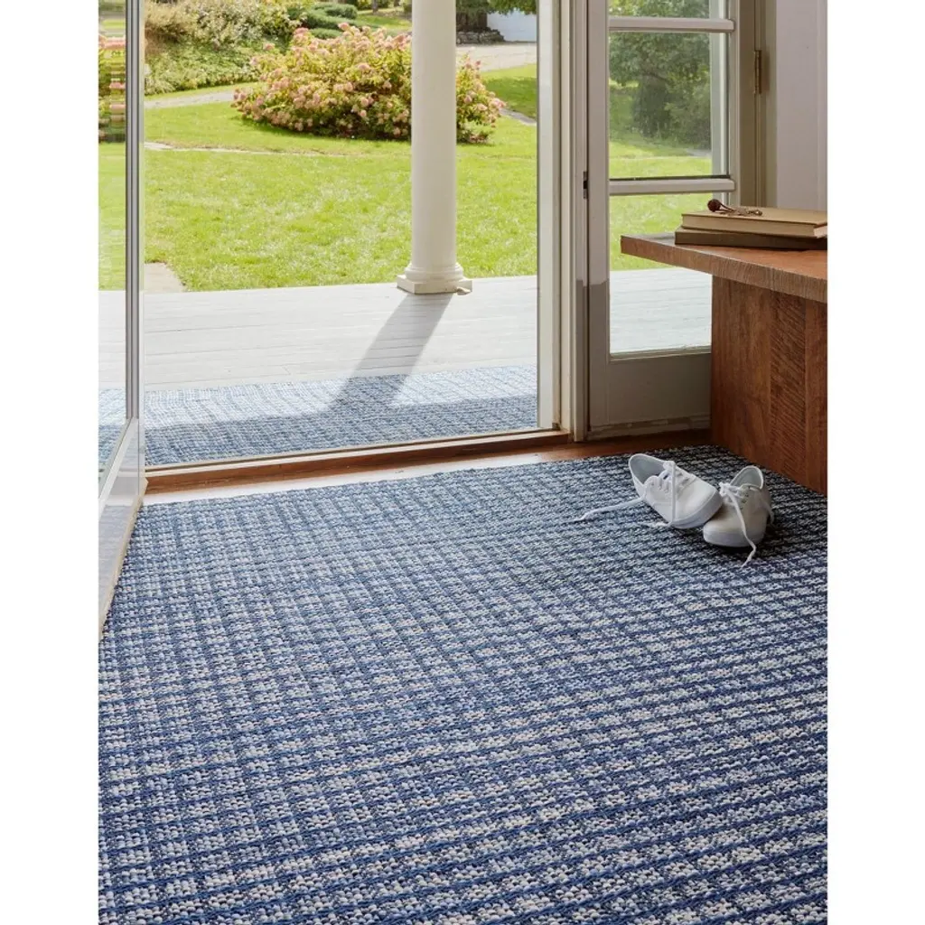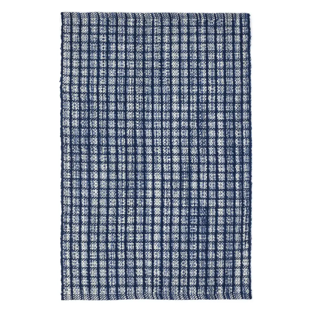 Inspired by a colorful knit throw, this indoor/outdoor rug is durable and washable. It features a unique texture produced by a mix of varying shades of blue and ivory yarns that peek through from under a navy checkerboard pattern. Use it to create a cozy feel in high-traffic areas without having to worry about cleanup!