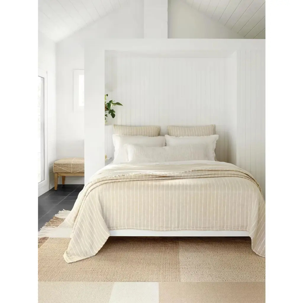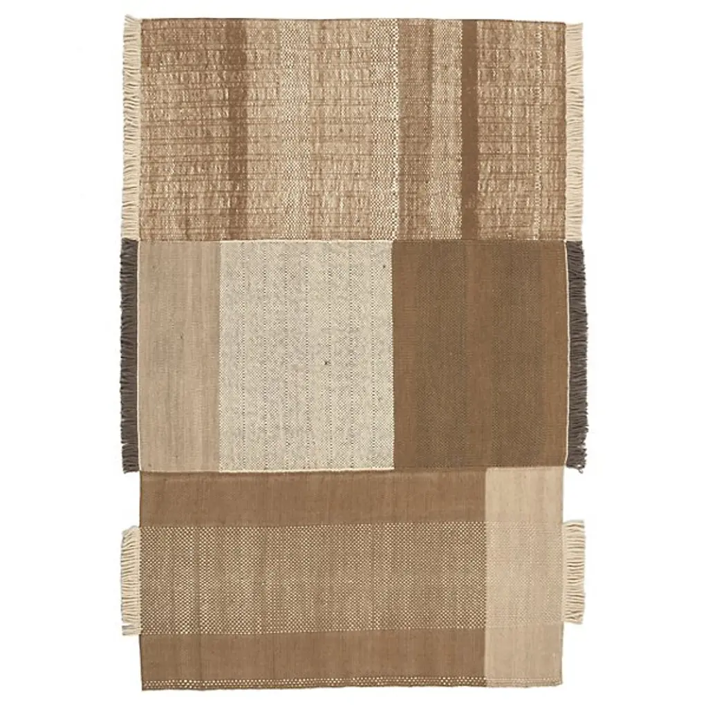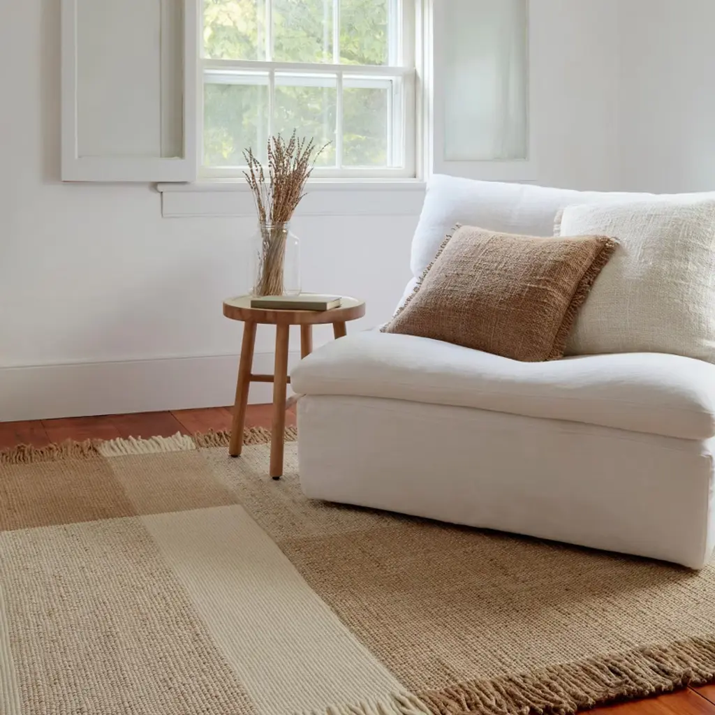A fresh and modern play on vertical and horizontal stripes, woven in strips and sewn together for a unique effect. In raw, natural heathered shades, this heftier flatwoven rug's rich texture and muted tones derive from a blend of cozy wool, hardworking jute, and soft cotton. Finished along the sides with an alternating chunky felted wool and substantial natural twisted jute fringes.