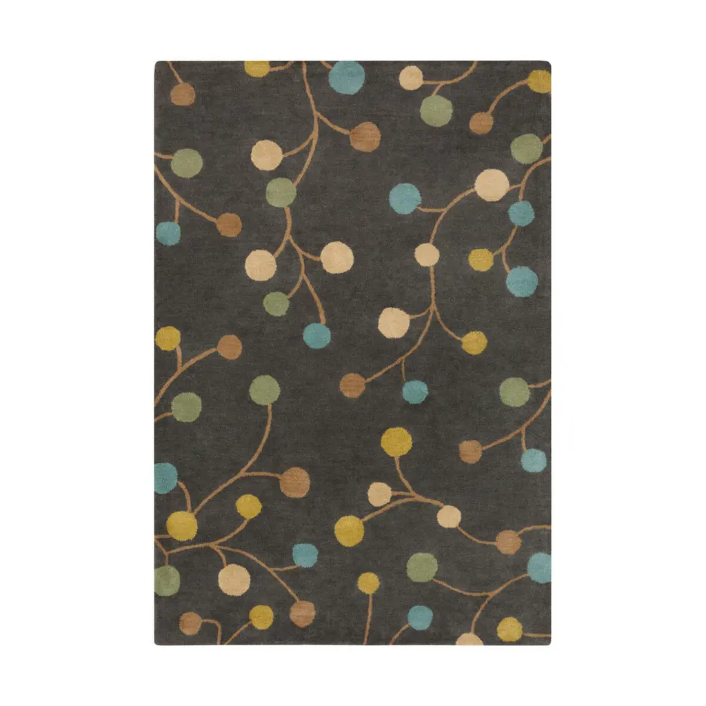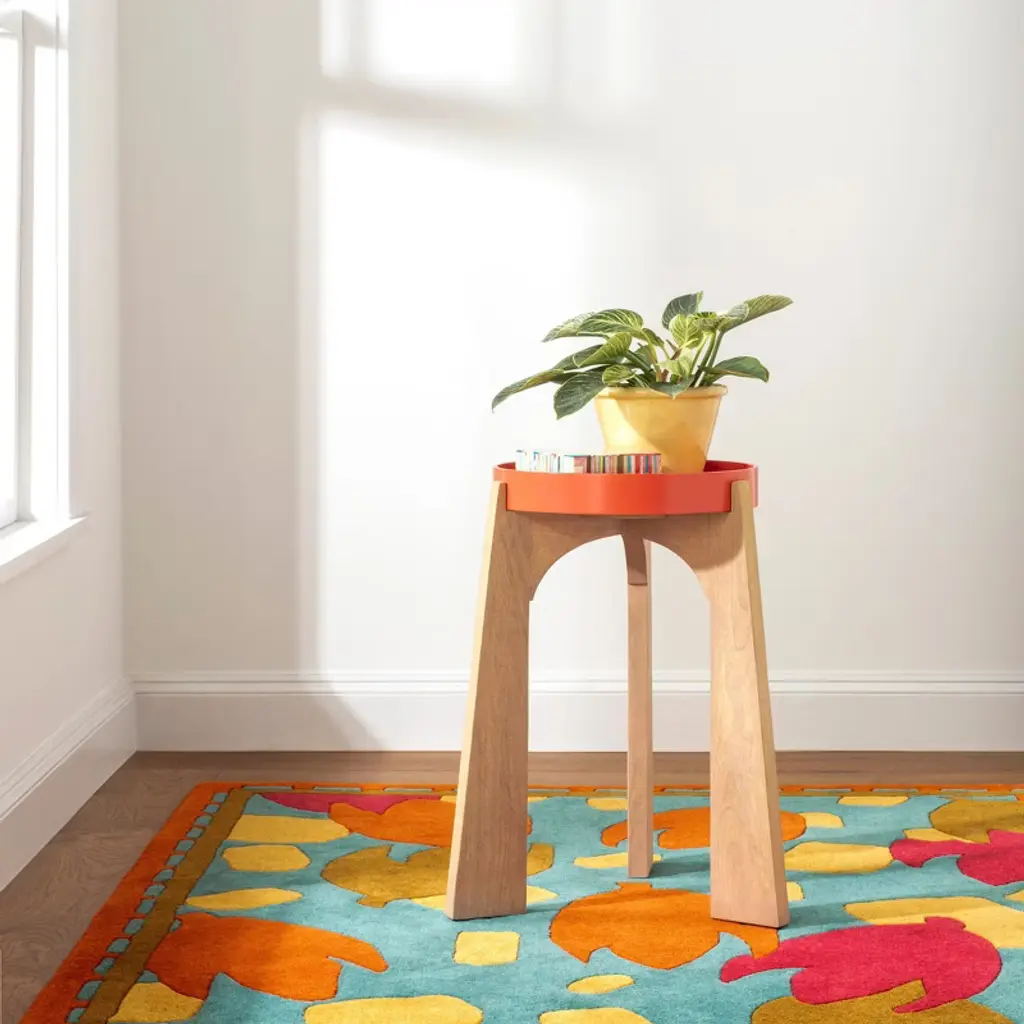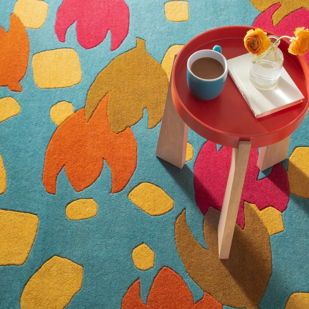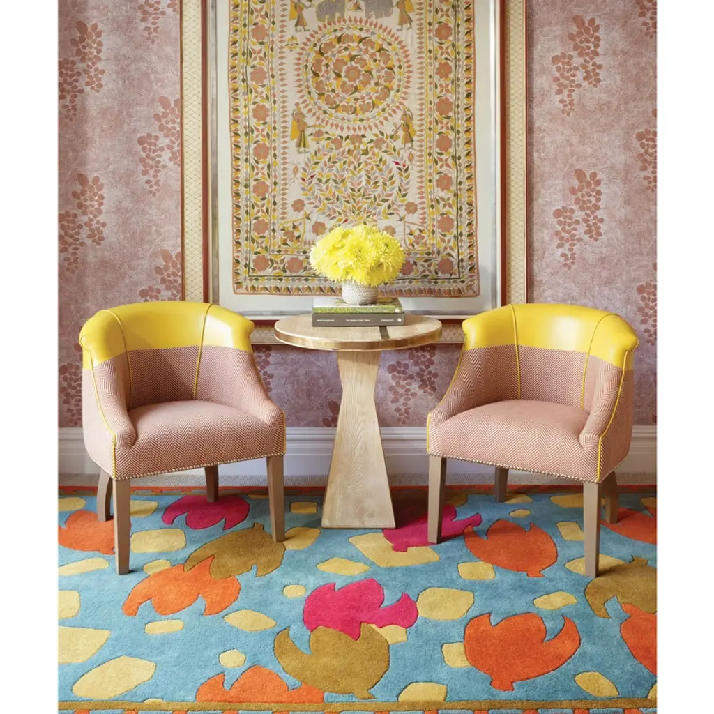 Create an oasis of color, curiosity, and calm with this luxurious and opulent wool rug. Hand tufted in a bold and vibrant design from the studio of Kit Kemp, co-owner and Creative Director for Firmdale Hotels, and then hand-carved to outline the individual forms for more definition. Soft and plush in exuberant shades of Ocean, with Gold, Olive, Spice and Crimson. Kit is known for taking vibrant, colorful and joyful adventures in style, layering craftsmanship, art, found objects and bespoke detailing in all her interiors.