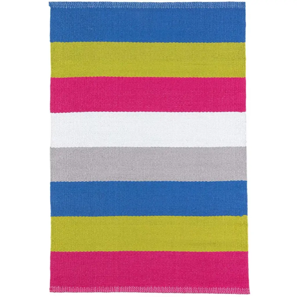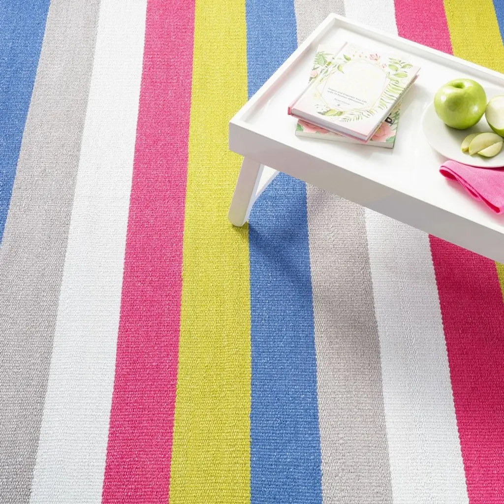 You always know where you stand with this straightforward, horizontal, chunky-striped flatweave rug in French Blue, Sprout, Fuchsia, White and Grey. Available in a variety of modern markings, our latest matte PVC Indoor/Outdoor rug breed is light and dense with good stability. It lies flat and stays put with the look and feel of a natural fibre. Because it is water resistant, it exhibits the same easy clean up qualities, and stain and mildew resistance, as our other performance rugs.