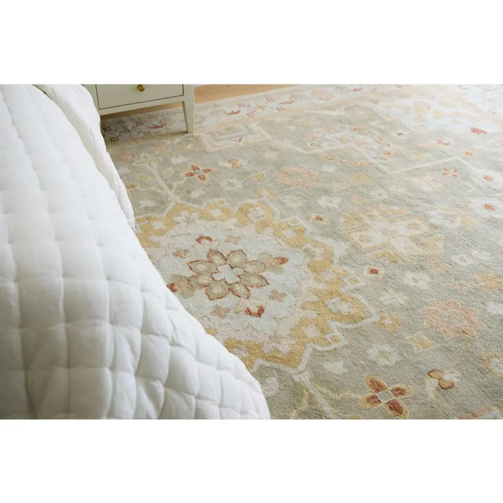 Part of our Masterpiece Collection that draws from the rich heritage of traditional, Turkish Oushak rugs. Woven and hand-knotted by master weavers in India, every detail – from the intricate motifs down to the finest yarn – speaks to the unparalleled quality and artisan craftsmanship of these vintage-inspired rugs. The Kendra Sky Hand Knotted Wool Rug, a refined blend of olive, taupe, and sky blue, effortlessly captures the eye with its timeless, classic design. The soft yet captivating colors bring a touch of sophistication, making this rug a versatile piece that adds style and warmth wherever it goes.