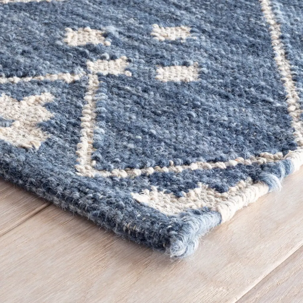 Our Kota Handwoven Wool Rug has a bold, geometric pattern and a subtle, metallic silver thread woven throughout its indigo base. This rug is low-profile and durable, perfect for homes with kids and pets and high-traffic spaces, like hallways and living rooms.