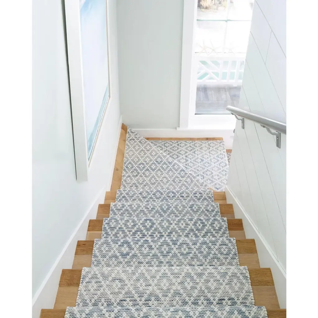 Lightweight, easygoing flatweave cotton rug with a classic diamond pattern made new with a faded melange of monochromatic mineral blues.
