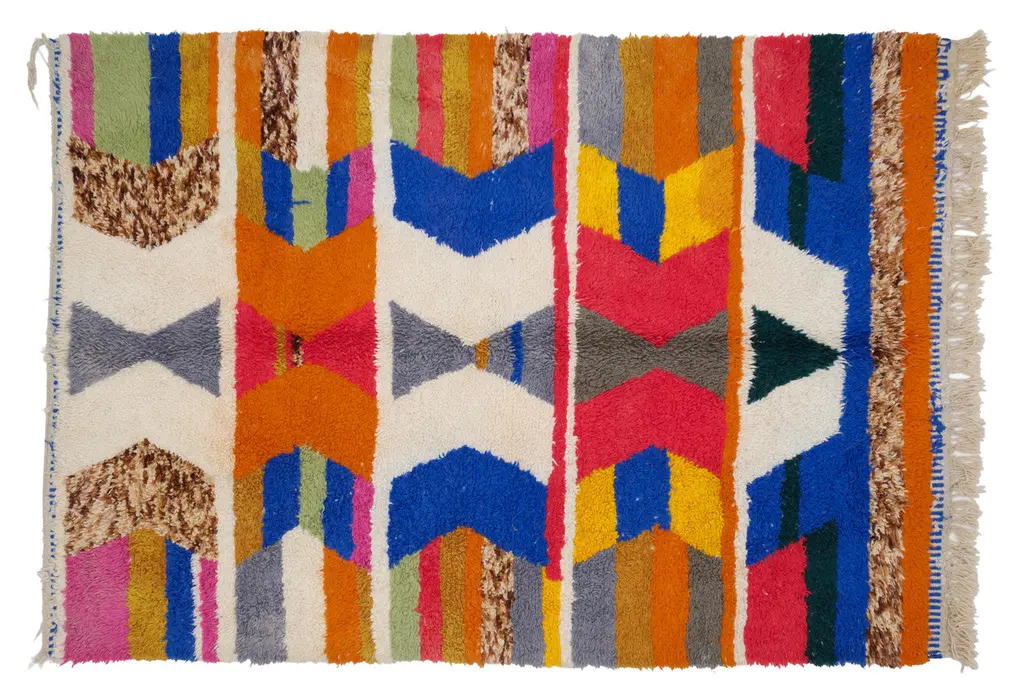 A rainbow of colorful cutting room scraps gets a second chance to shine as they weave their way through a natural jute ground. Each handwoven rug has a unique placement of kaleidoscopic colors in a bold geometric pattern, enhancing its beauty. Guaranteed to light up your floor, this sustainably produced rag rug ticks all the boxes.