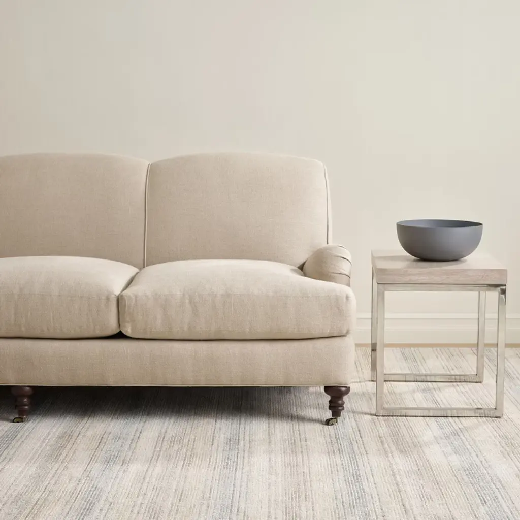 Hazy stripes in blue and brown float like moonbeams on a winter horizon, the natural ground deep with subtle sheen and luster, delicate and profound.