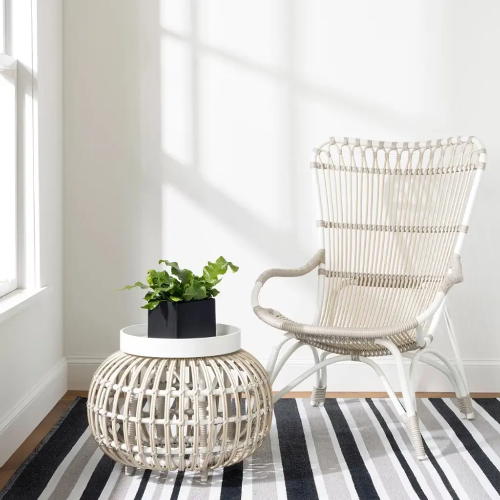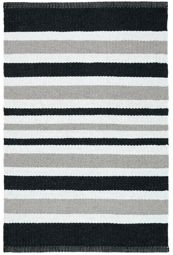 This graduated stripe flatweave rug in Black, Khaki and White has passed all the tests with high honors! Available in a variety of modern markings, our latest matte PVC Indoor/Outdoor rug breed is light and dense with good stability. It lies flat and stays put with the look and feel of a natural fibre. Because it is water resistant, it exhibits the same easy clean up qualities, and stain and mildew resistance, as our other performance rugs.