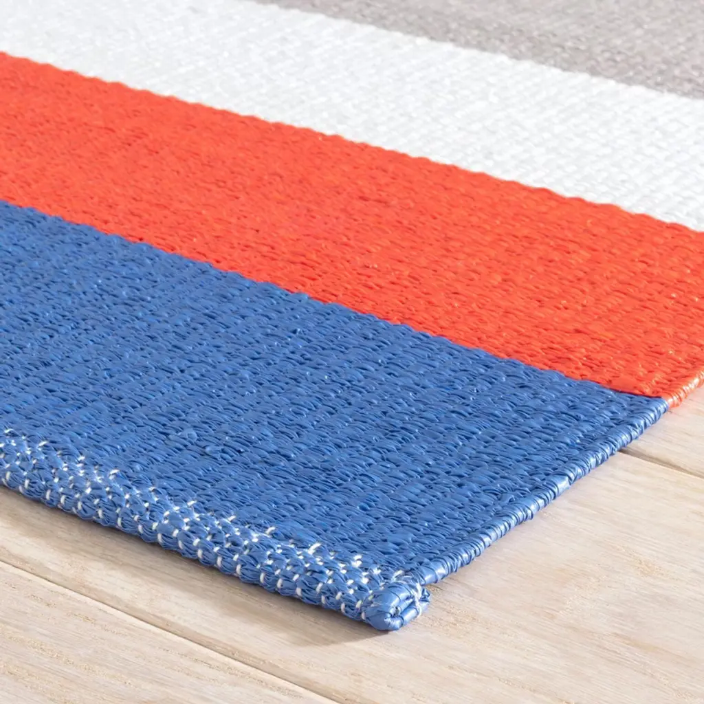 You always know where you stand with this straightforward, horizontal, chunky-striped rug. Offered here in a reversible flat weave. Our latest matte PVC Indoor/Outdoor rug breed is light and dense with good stability and comes in a variety of modern markings. It lies flat and stays put with the look and feel of a natural fibre. Because it is water resistant, it exhibits the same easy clean up qualities, and stain and mildew resistance, as our other performance rugs.