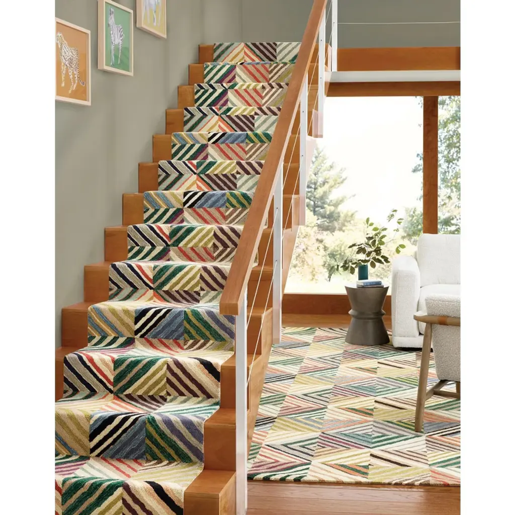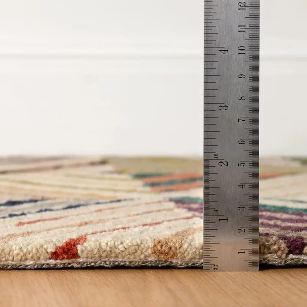 Add color to any space with this durable, one-of-a-kind rug, expertly handcrafted from 100% wool. Inspired by a hand-painted artwork from Europe, its medley of muted hues, patchwork squares, and ticking stripes is simply beguiling.