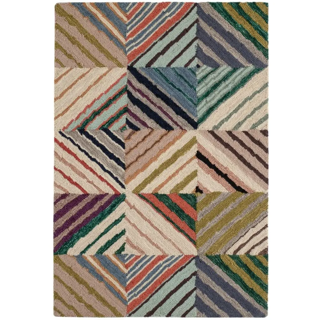 Add color to any space with this durable, one-of-a-kind rug, expertly handcrafted from 100% wool. Inspired by a hand-painted artwork from Europe, its medley of muted hues, patchwork squares, and ticking stripes is simply beguiling.