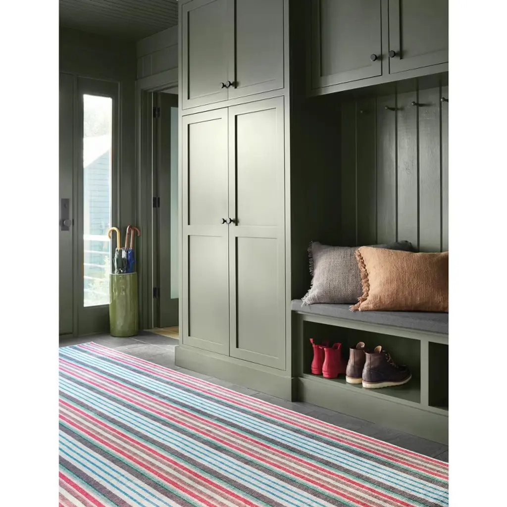 Part of our best-in-class collection of design-focused, machine-washable rugs. Even cowgirls get the blues (and red and browns and whites). With its bold repeating stripes and versatile colors, this superior quality, machine washable rug is at home on the range, or in any room you want to place it. Ideally suited for high-traffic areas like playrooms, kitchens, and entryways, it lies flat and remains soft underfoot with no shedding or fuzzing, even after multiple washes.