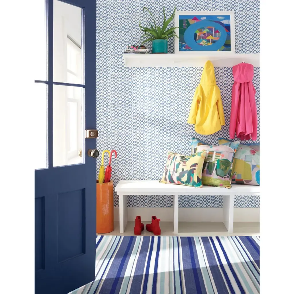 In this fresh favorite, pale marine shades are paired with indigo, navy, and grey stripes on a bright white base. Made of polypropylene and terrific for high-traffic areas, this washable, scrubbable, and bleachable indoor/outdoor rug will stand up to wear and tear for years to come.