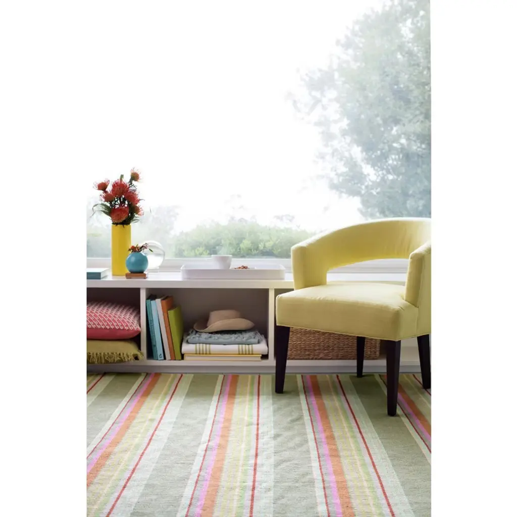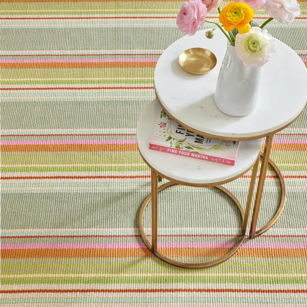 Bright stripes of red, orange, pink, citrus, and sky pop against sage green on this woven cotton area rug. These rugs are so adaptable they make themselves at home in any room. Constructed using a hand loomed flat weave in durable 100% cotton, these rugs are lightweight, reversible and affordable.