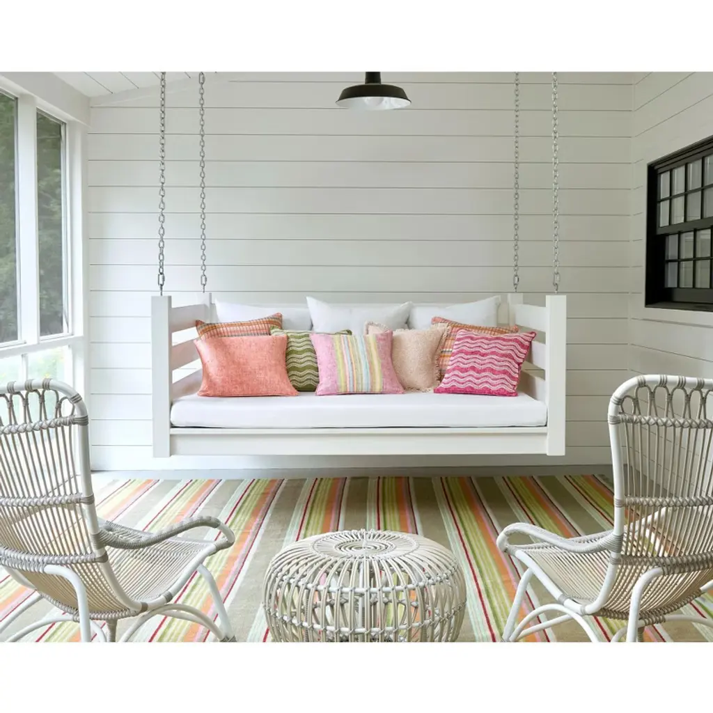 Bright stripes of red, orange, pink, citrus, and sky pop against sage green on this eco-friendly and washable indoor/outdoor rug made of recycled polyester. Use this rug as a punch of color in high-traffic areas like the entryway, stairs, or kitchen.