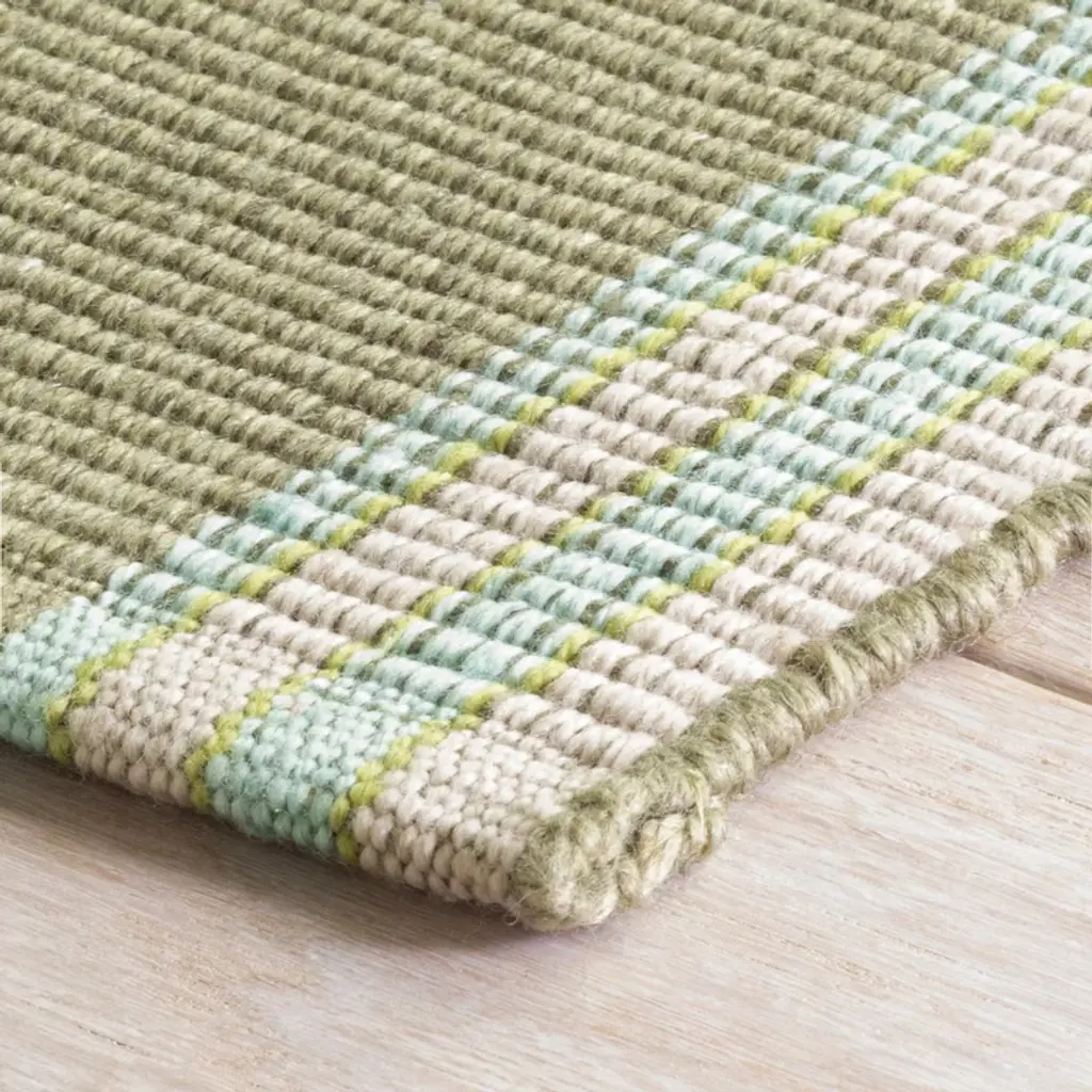 Bright stripes of red, orange, pink, citrus, and sky pop against sage green on this eco-friendly and washable indoor/outdoor rug made of recycled polyester. Use this rug as a punch of color in high-traffic areas like the entryway, stairs, or kitchen.