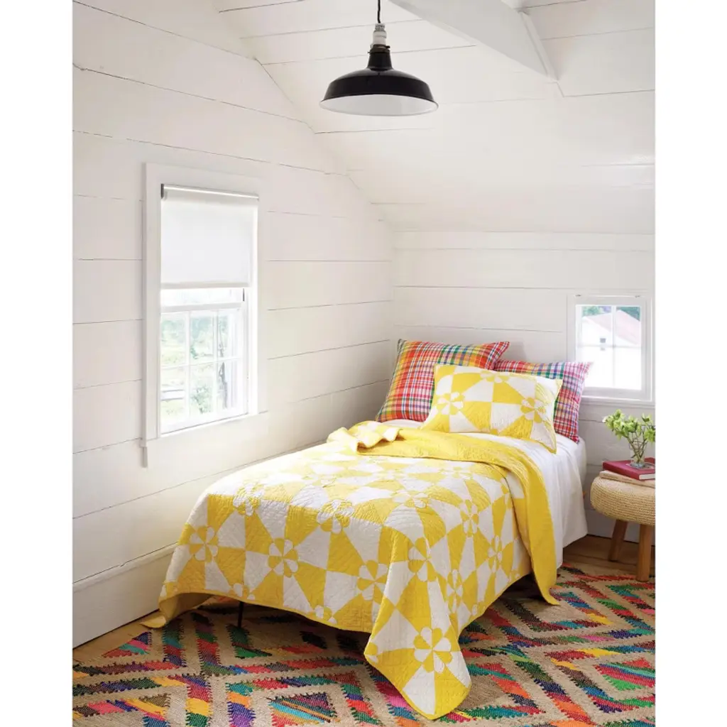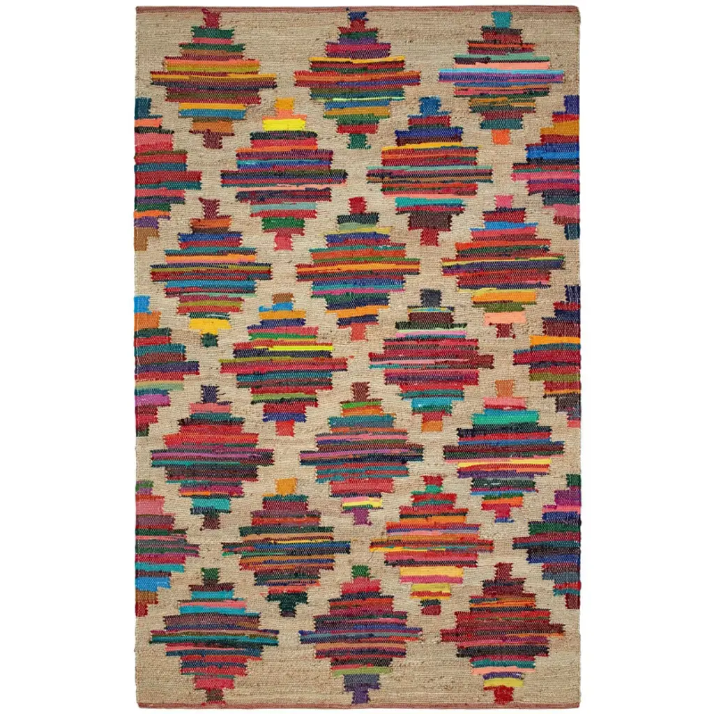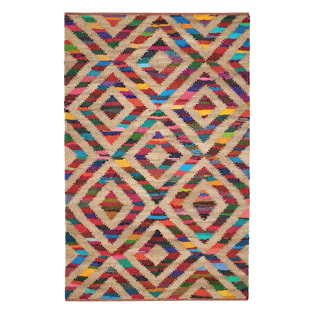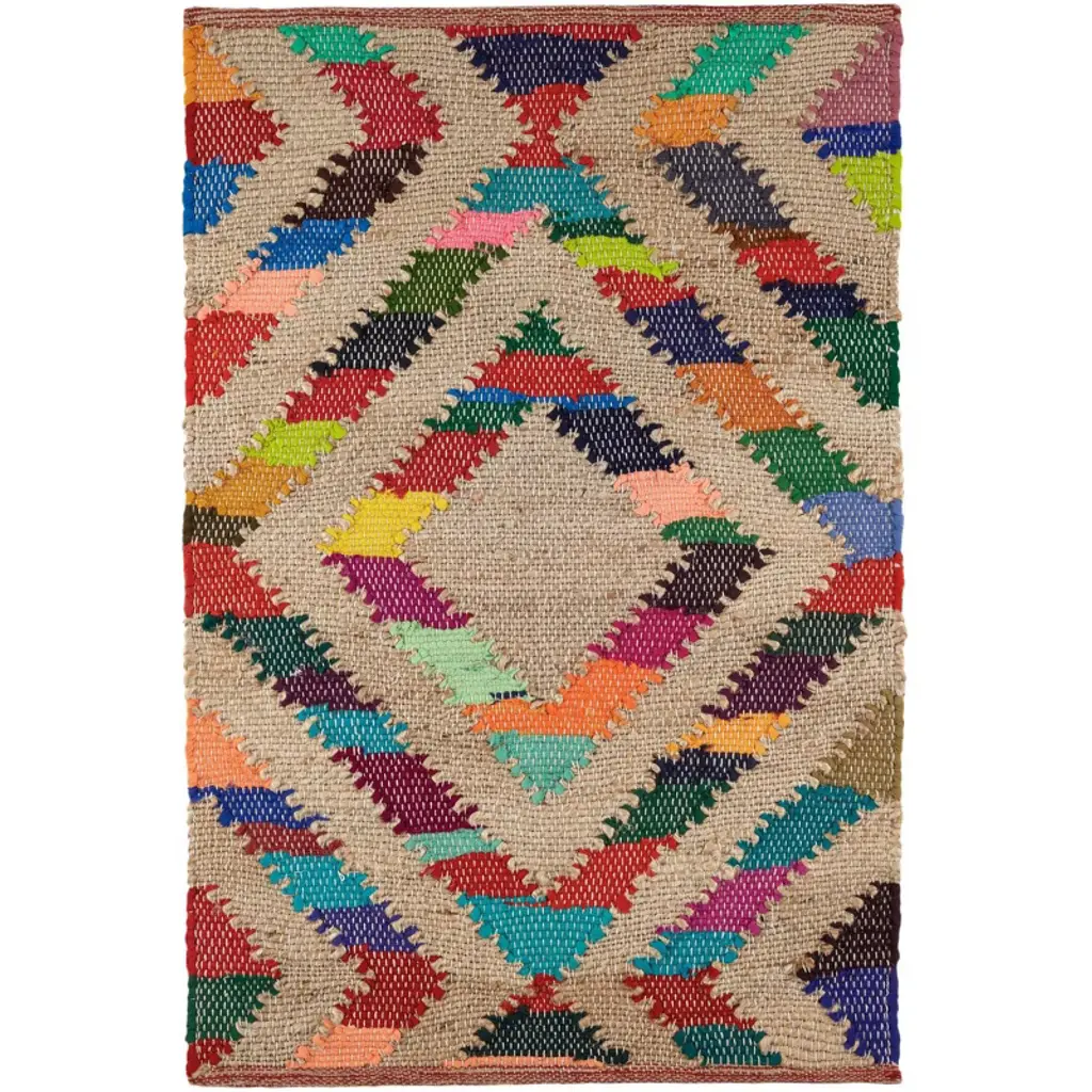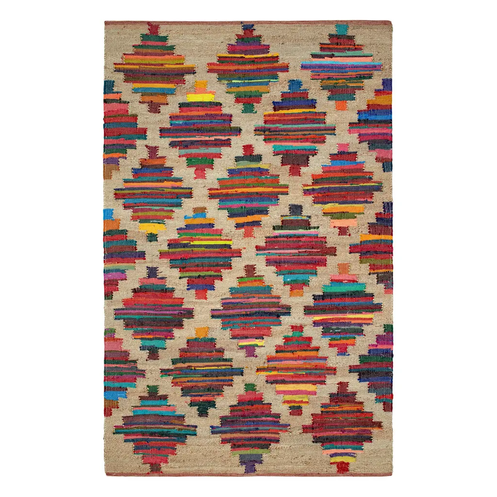 As radiant as a stained glass window, strips of cutting room scraps get a second chance to shine as they weave through a natural jute ground. Each handwoven rug has a unique placement of rainbow colors in a bold geometric pattern, enhancing its beauty. Guaranteed to light up your floor, this sustainably produced cotton, and jute rug ticks all the boxes.