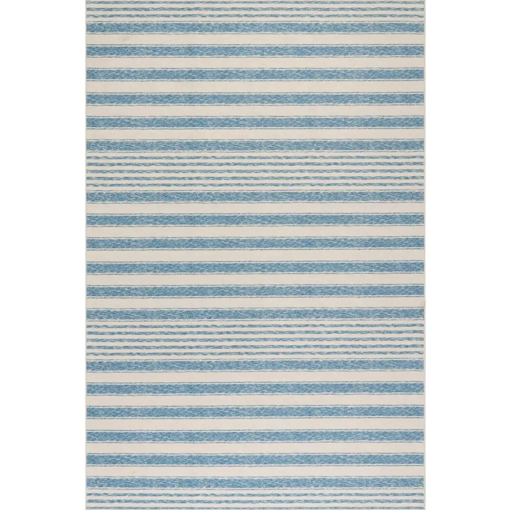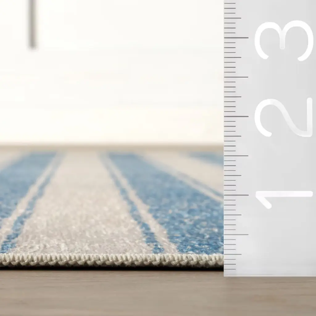A crisp striped design brings a coastal vibe to this washable synthetic rug. It's a practical and stylish choice for any room, with a versatile look that's easy to clean and maintain.