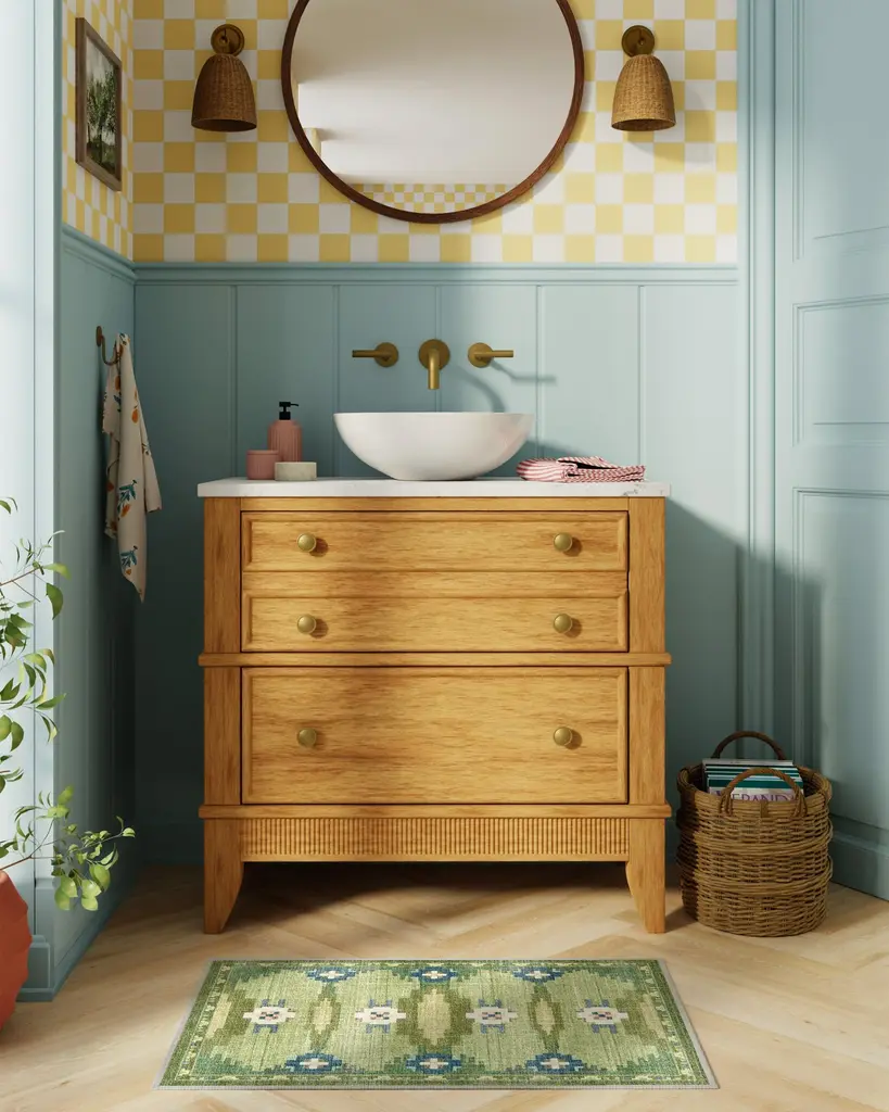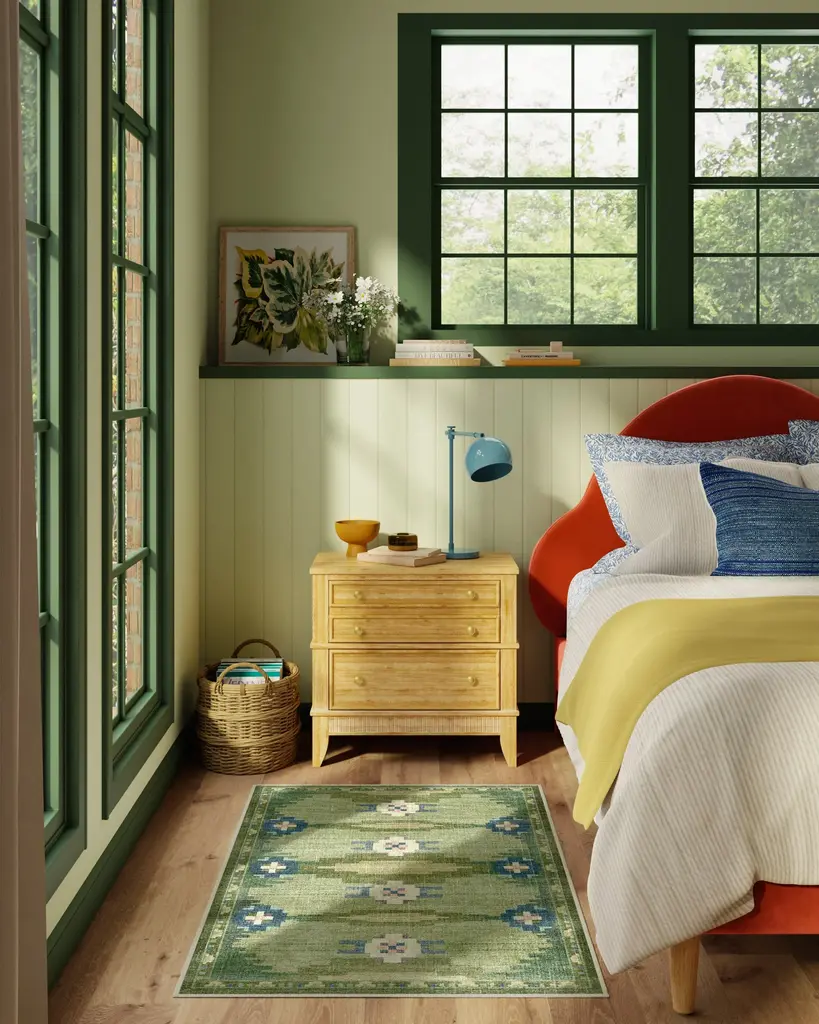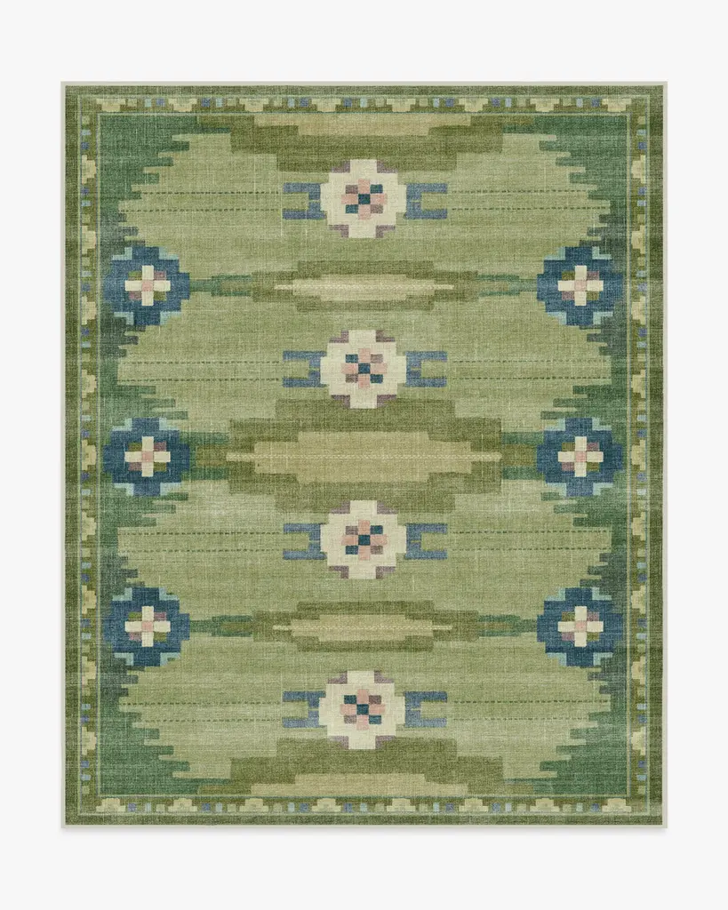 Inspired by the rich heritage of Nordic design, the Annika Green Rug seamlessly blends folk tradition with modern geometric sophistication. A palette of fern greens, antiqued chartreuse, deep blue, and light slate blue is complemented by soft cream, mauve, and pale pink for a balanced look. Water-resistant, stain-resistant, and machine-washable. Colors may vary slightly according to your device and the lighting in your space.