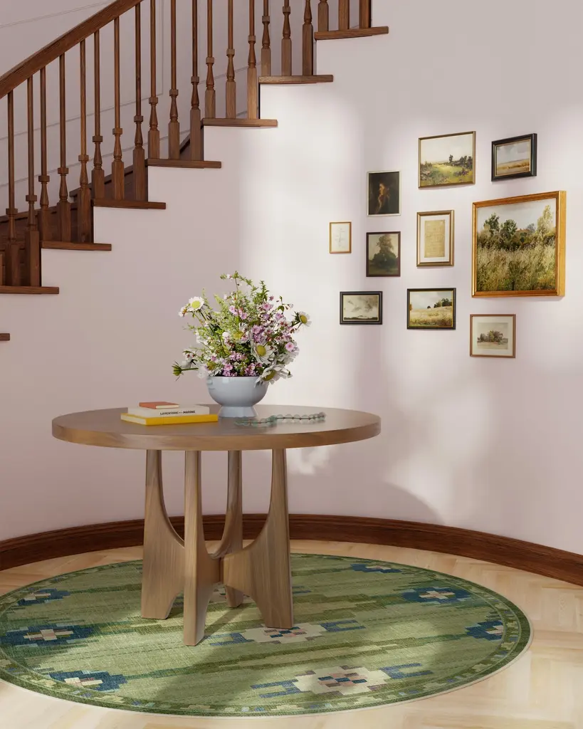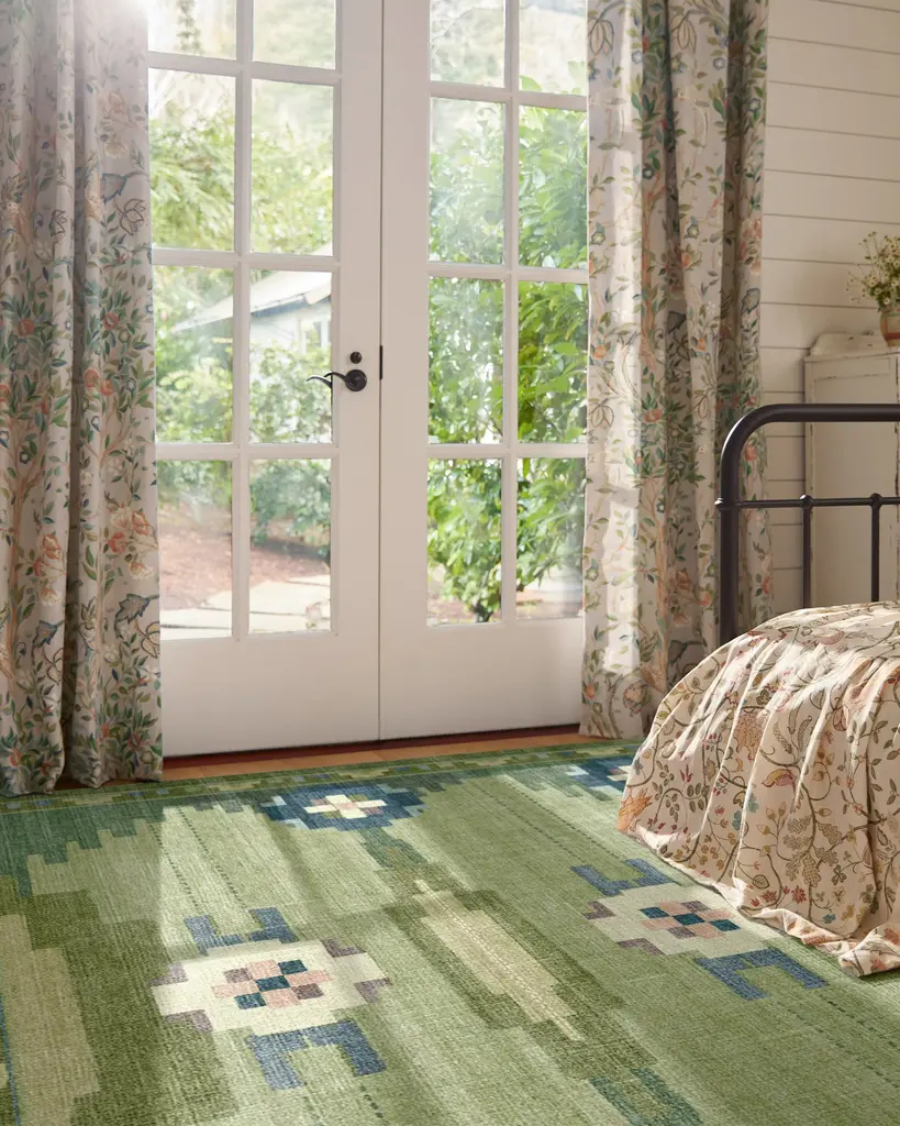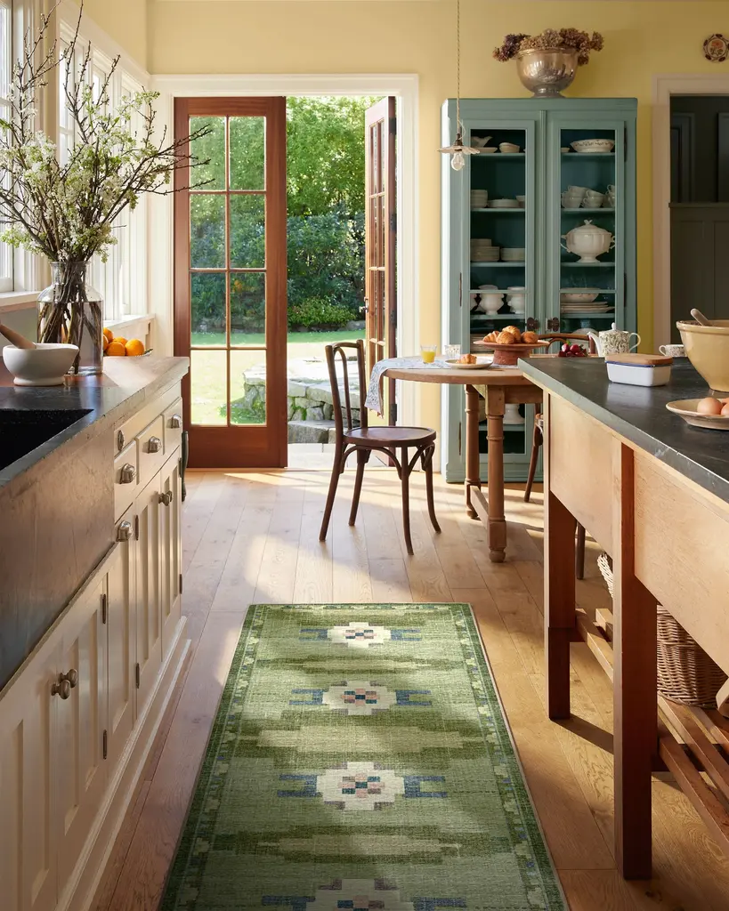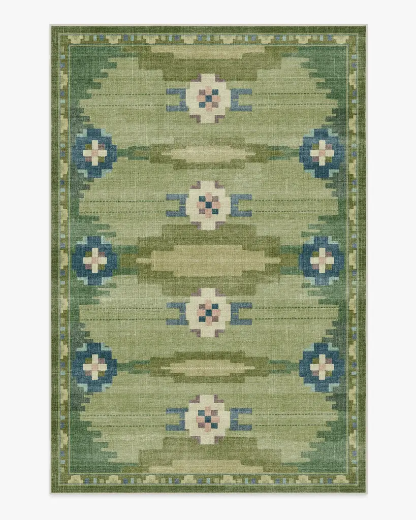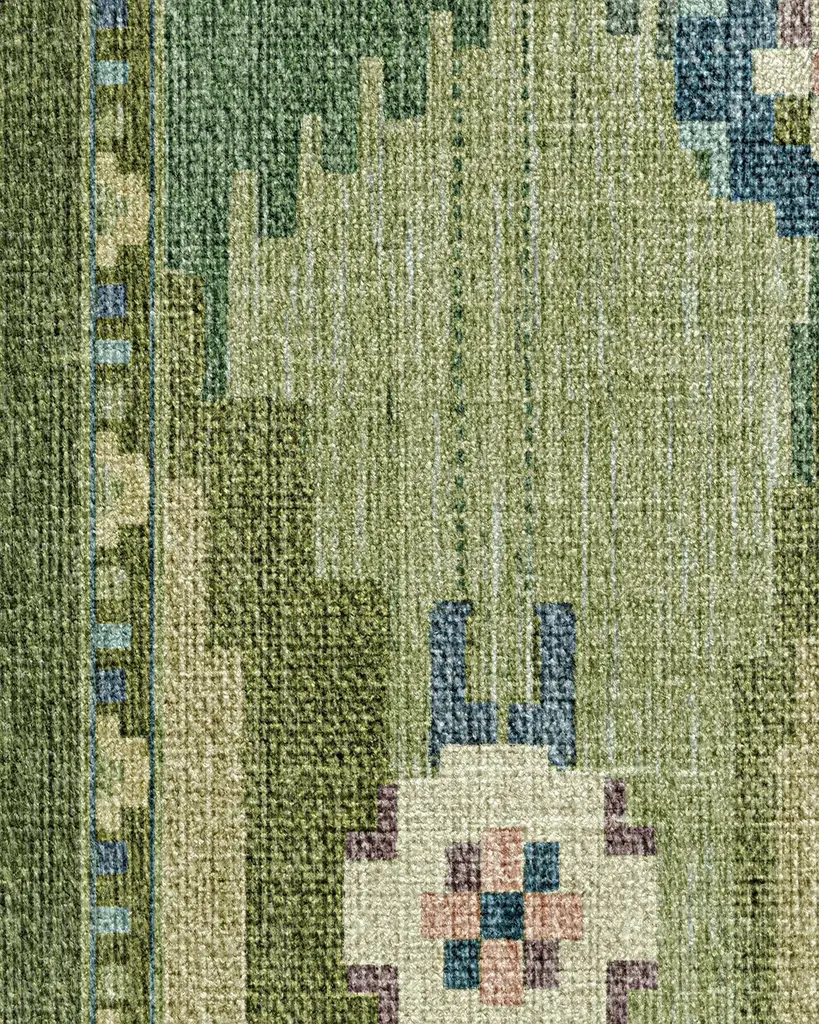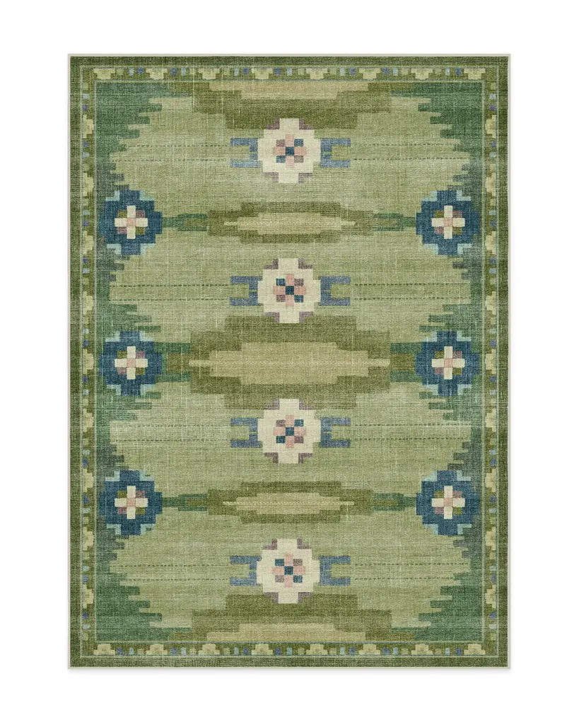Inspired by the rich heritage of Nordic design, the Annika Green Rug seamlessly blends folk tradition with modern geometric sophistication. A palette of fern greens, antiqued chartreuse, deep blue, and light slate blue is complemented by soft cream, mauve, and pale pink for a balanced look. Water-resistant, stain-resistant, and machine-washable. Colors may vary slightly according to your device and the lighting in your space.