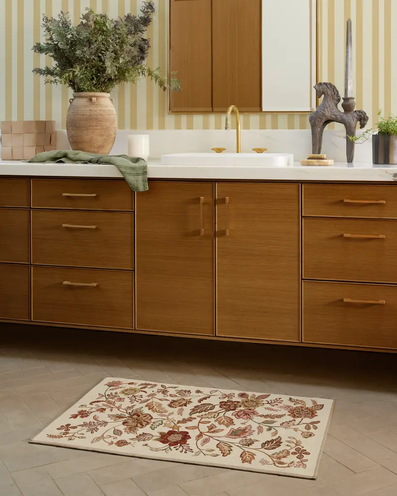 Embrace change—or at least the changing of the seasons with the Anonna Burgundy Multicolor Rug. This design beautifully captures the flow of autumn foliage with a combination of dusty pink, terracotta, olive green, taupes, light browns, and burgundy, along with pops of gold and light yellow on a light cream setting. Water-resistant, stain-resistant, and fully machine-washable. Colors may vary by device and lighting.