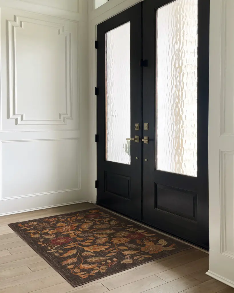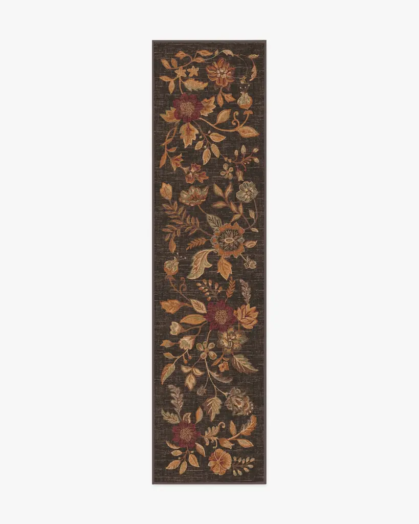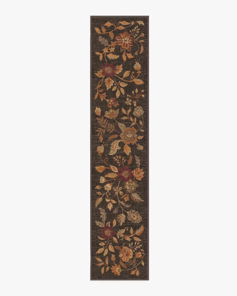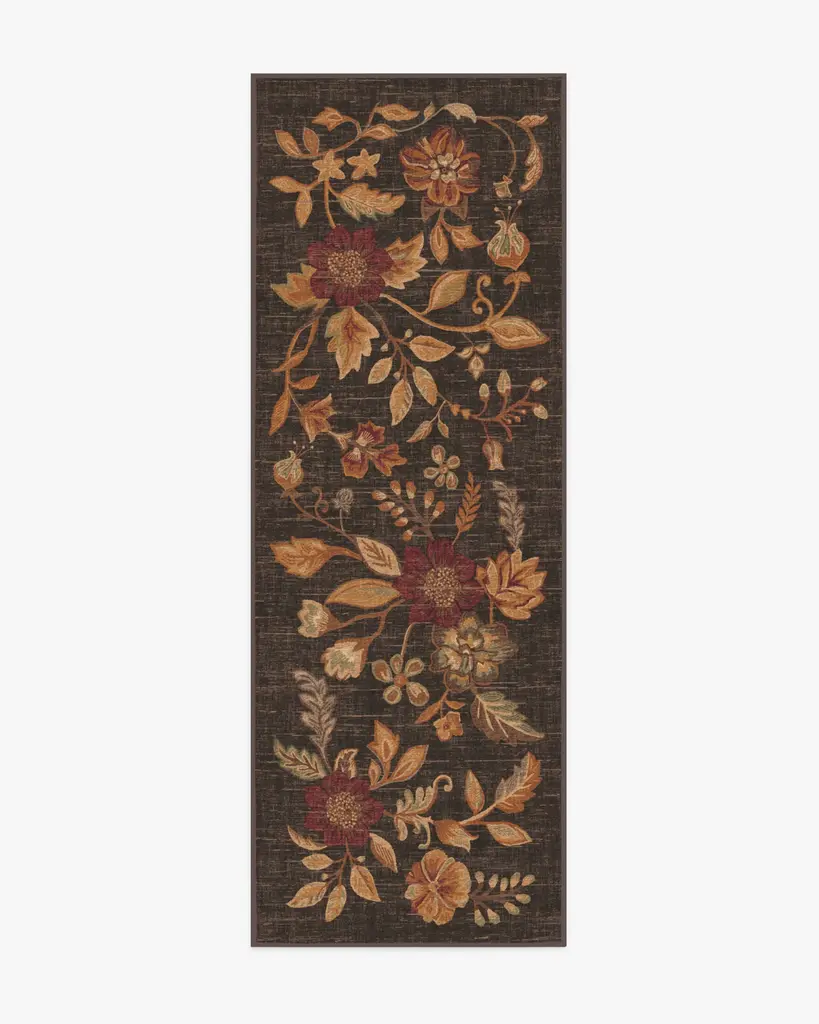 Turn a new leaf with our Anonna Dark Wood Rug. This organic design beautifully captures the flow of autumn foliage, bringing the warmth and colors of the coziest season indoors. Subtle hues of warm oranges, reds, and sages delicately blend against an earthy dark brown background. Water-resistant, stain-resistant, and machine-washable. Rug colors may vary slightly according to your device and the lighting in your space.