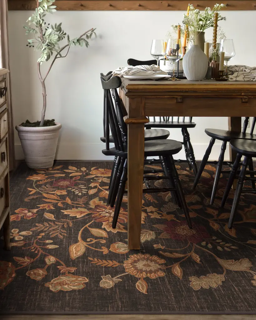 Turn a new leaf with our Anonna Dark Wood Rug. This organic design beautifully captures the flow of autumn foliage, bringing the warmth and colors of the coziest season indoors. Subtle hues of warm oranges, reds, and sages delicately blend against an earthy dark brown background. Water-resistant, stain-resistant, and machine-washable. Rug colors may vary slightly according to your device and the lighting in your space.