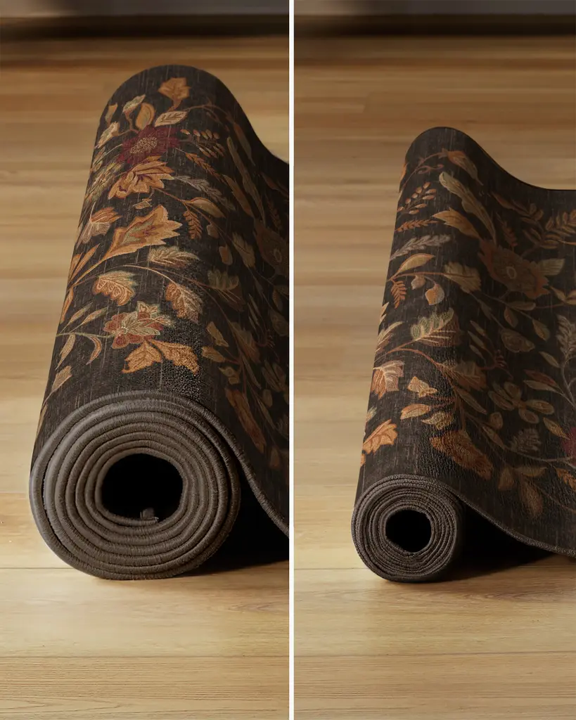 Turn a new leaf with our Anonna Dark Wood Rug. This organic design beautifully captures the flow of autumn foliage, bringing the warmth and colors of the coziest season indoors. Subtle hues of warm oranges, reds, and sages delicately blend against an earthy dark brown background. Water-resistant, stain-resistant, and machine-washable. Rug colors may vary slightly according to your device and the lighting in your space.