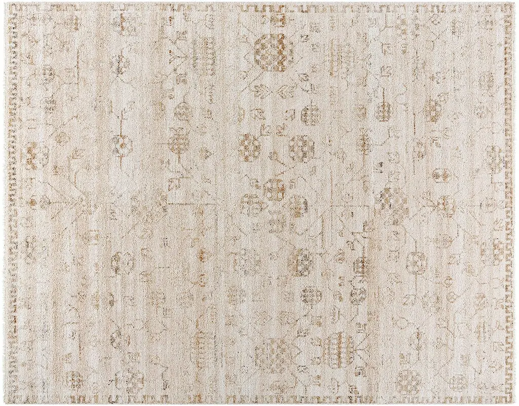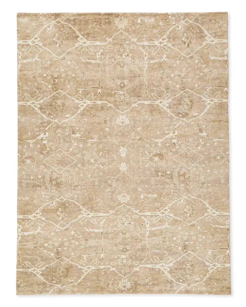 Golden ground. A rich celebration of antique Persian designs, hand-knotted of wool and viscose. Old-world intrigue.