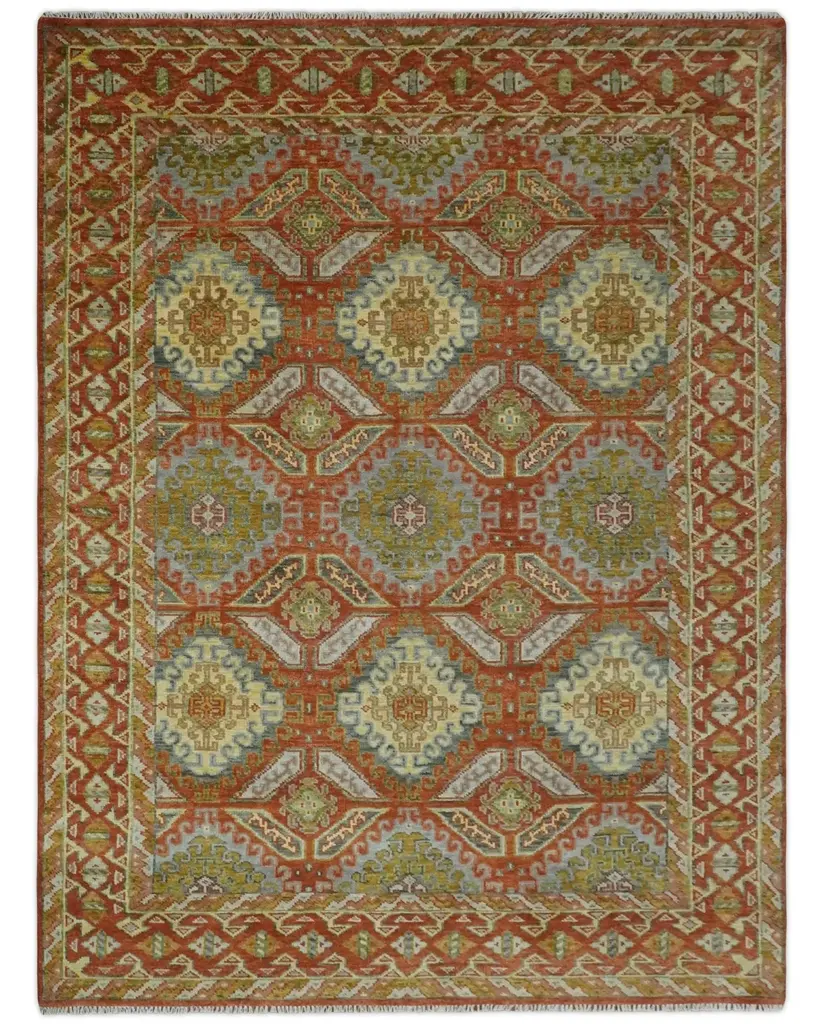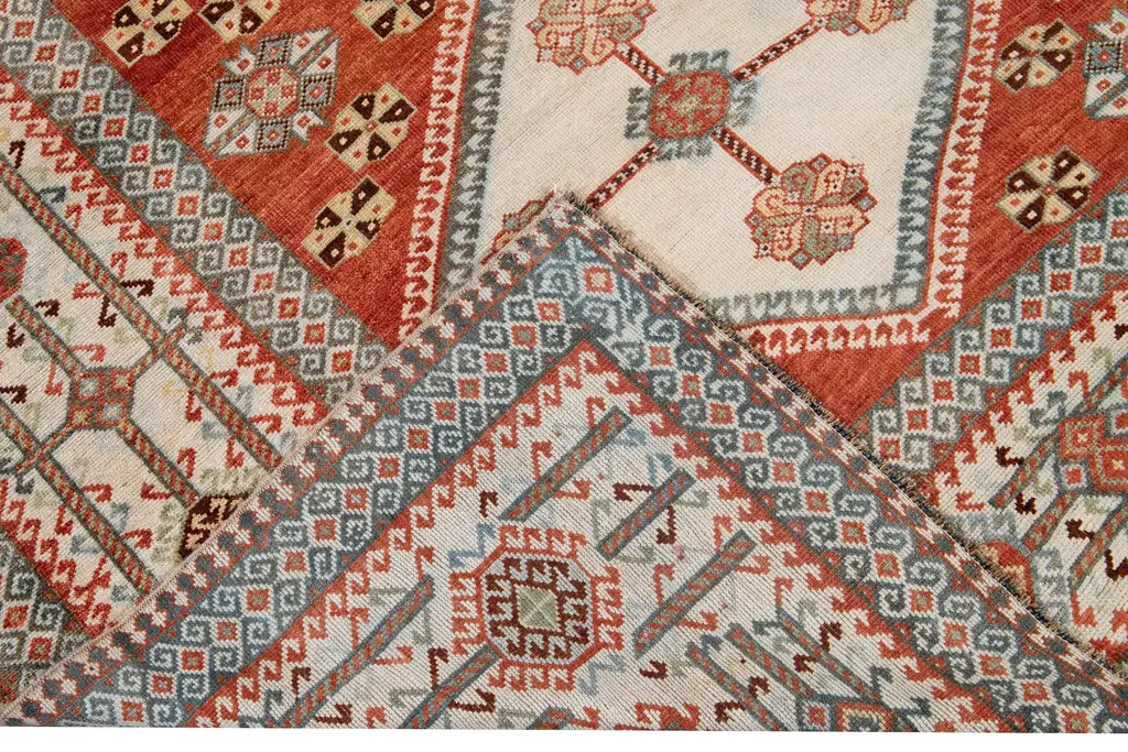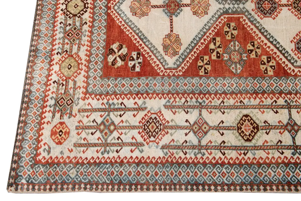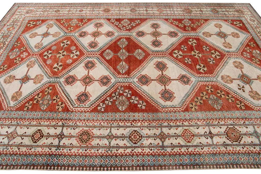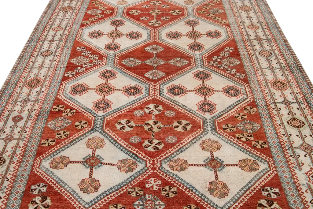 Beautiful Antique Afshar Rug, hand-knotted wool with a red field, beige field, tan, ivory and light blue accents in an all-over multi medallion geometric design. This rug measures 7' 2" x 10' 6"