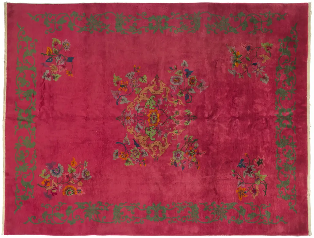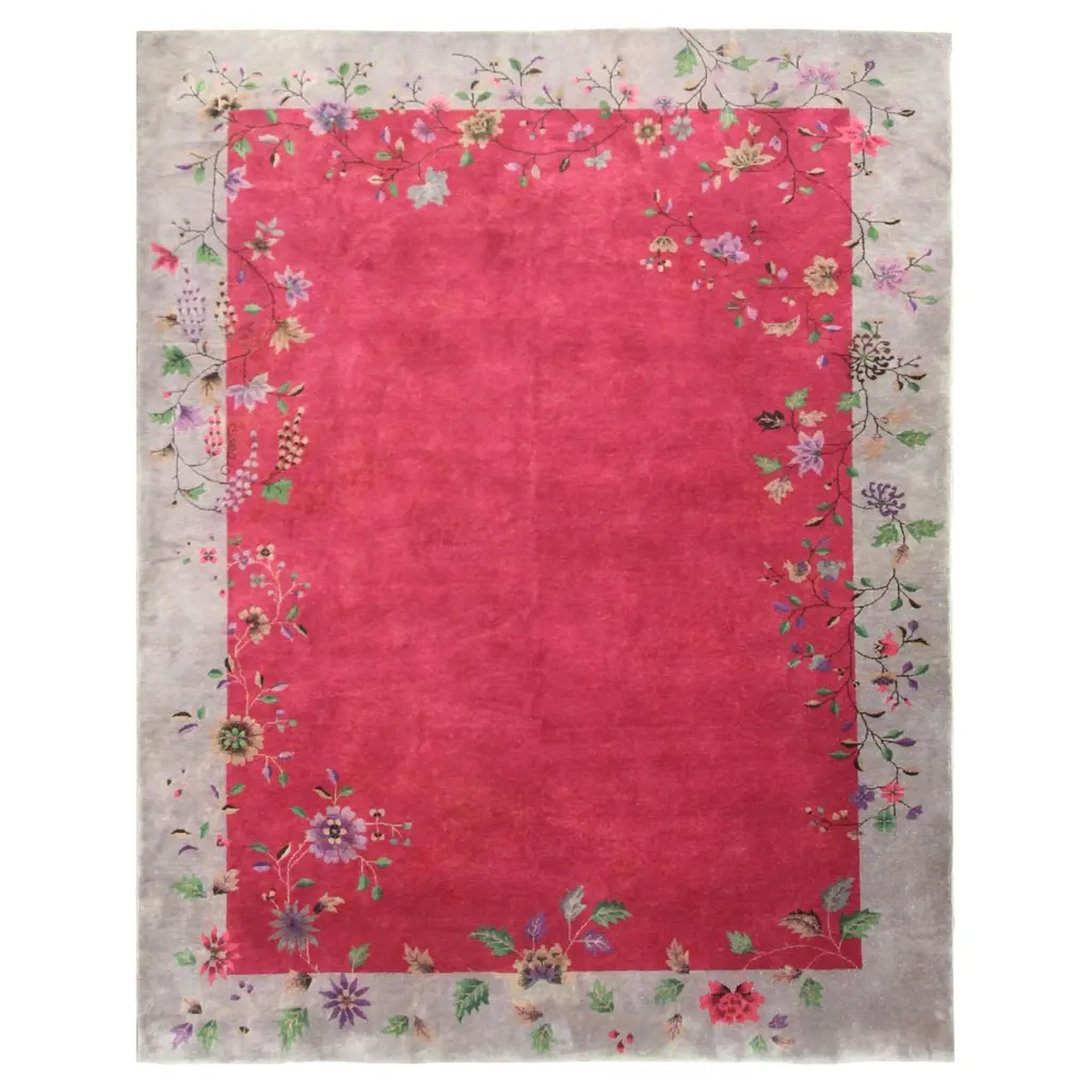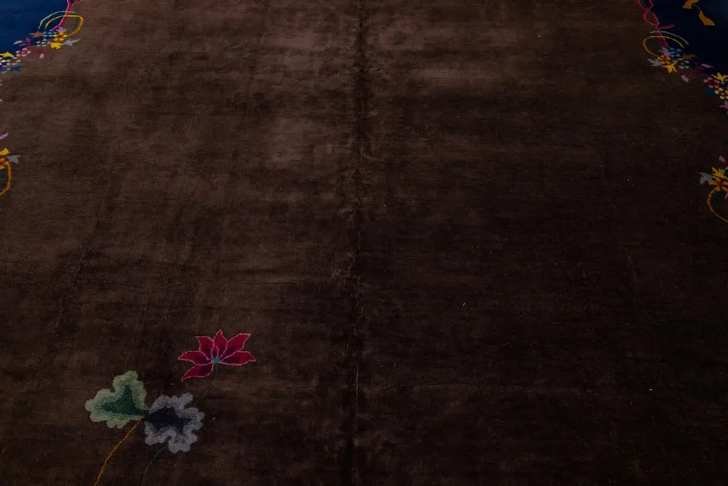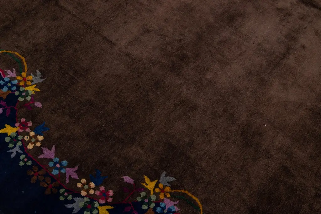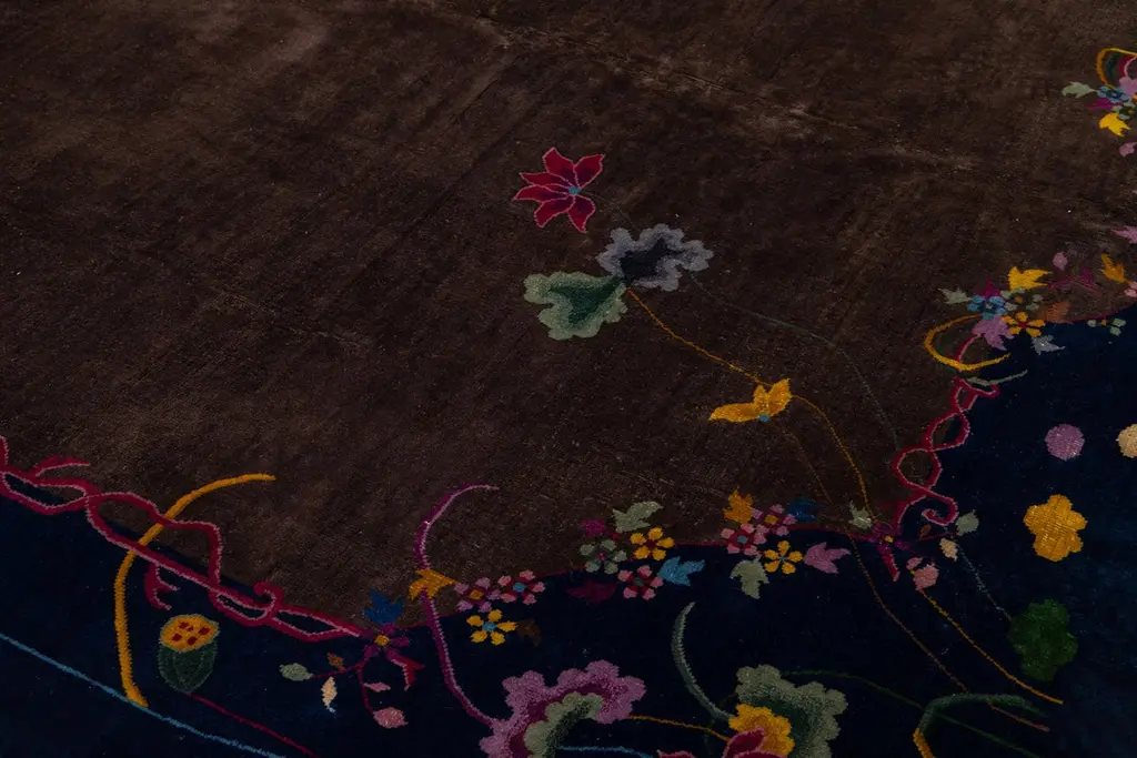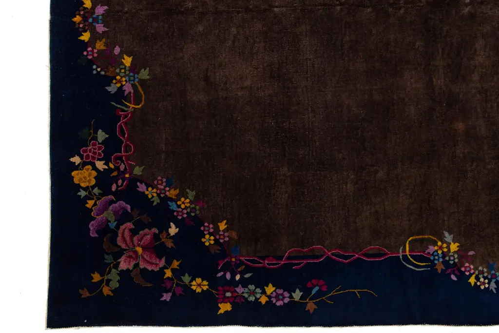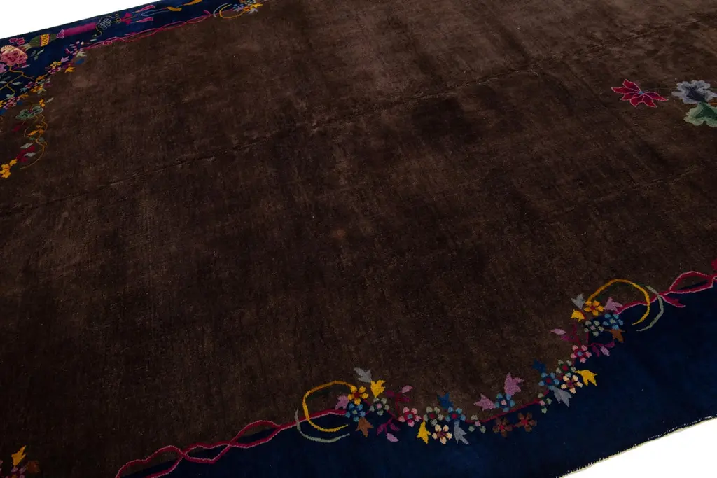 Beautiful antique Chinese Art Deco rug, hand-knotted wool with a brown field. This rug has a navy blue frame and multi-color accents in an all-over, Classic Chinese floral design.This rug measures 9' x 11'8".