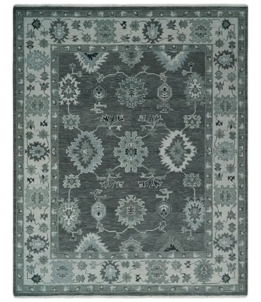 This Antique Hand Knotted Charcoal and Ivory Traditional Oushak wool area rug will bring elegance and timeless style to your home decor. Expertly hand-knotted by Turkish artisans to exacting standards, this exquisite rug is made from the finest wool that is durable and easy to clean. With its unique pattern and color combinations, it will add an air of sophistication to any room. Hand-Knotted SIZES ARE MADE TO ORDER IN 30-45 DAYS Made with Wool Color : Charcoal and Ivory Made with 28 knots per square inch This specific rug is made in India, in the city of Bhadohi. Bhadohi is one of the biggest rug manufacturing cities. Carpet weaving in the region dates back to the 16th century during the reign of Akbar. The skilled artisans of Bhadohi have been carrying the tradition of rug-making for centuries. USERS GUIDE Avoid prolonged moisture Vacuum regularly and/or shake to remove dust Do not pull any loose threads. Use scissors to simply cut the ends The blot spills immediately with a white cloth. Harsh chemicals may damage or fade the rug Use rug protectors under heavy furniture