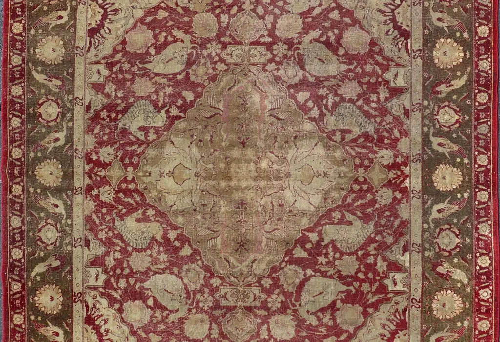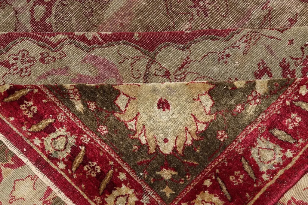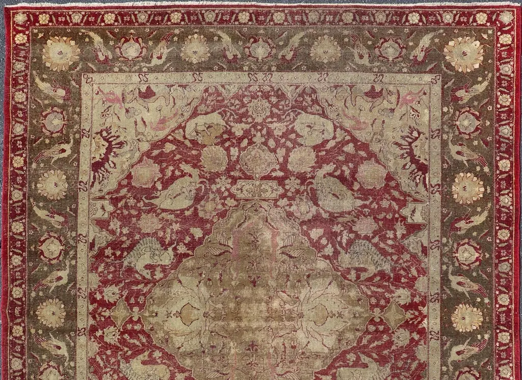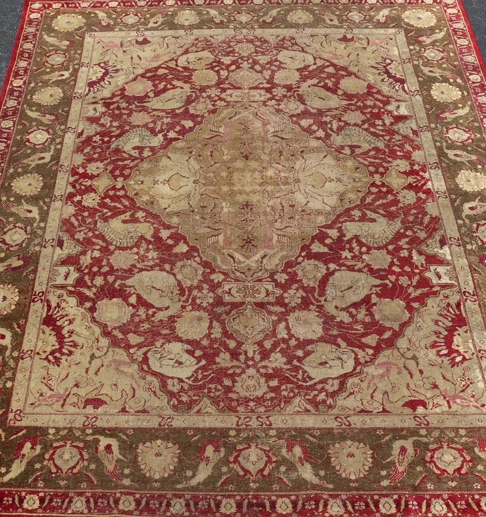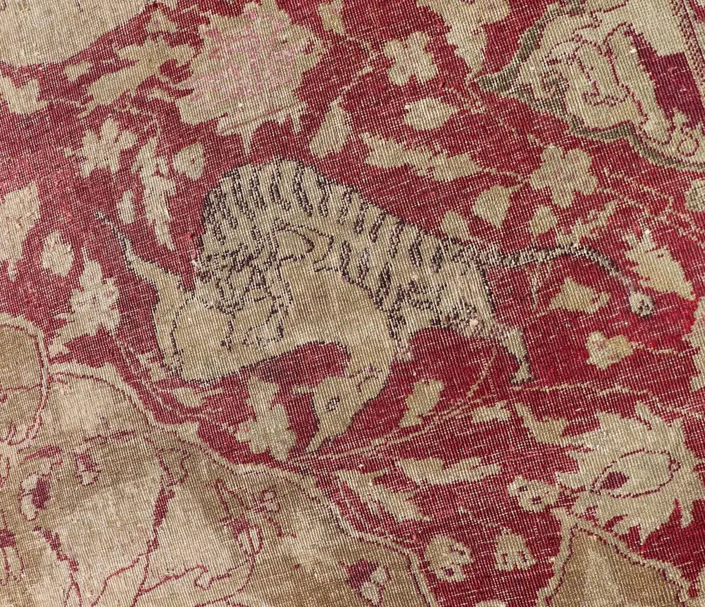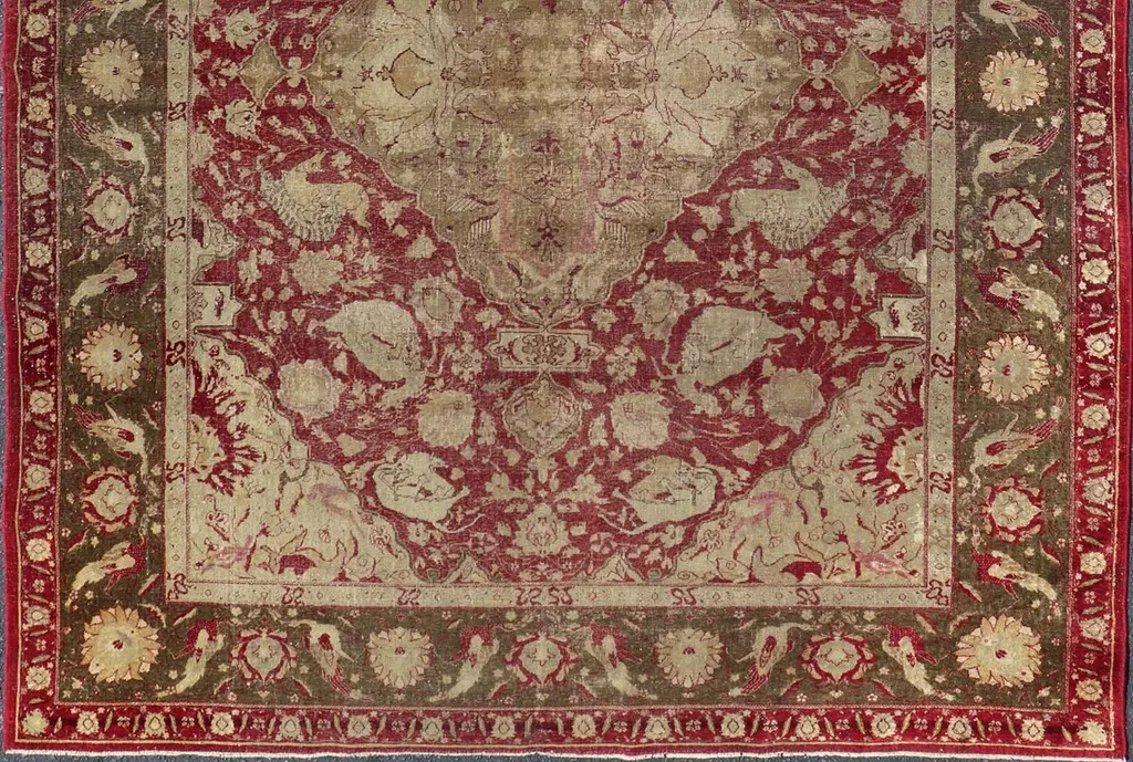 Antique India Agra Rug from the end of Mughal Empire period/ remanent of the Mughal whom ruled most of the Asia. This 18th century Indian rug displays a Central Medallion Design in wine Red, Green, Camel and Tan. Keivan Woven Arts / rug X23-0304, late 18th century Indian Agra.Measures: 5'11 x 7'7 This magnificent antique Agra rug, circa 1790, features a striking central medallion design in soft camel/light brown, surrounded by an intricately detailed wine red field adorned with florals, hunting scene and vine motifs. The deep green border is filled with rosettes and floral patterns, framed by a series of delicate guard borders. Handwoven in India using high-quality wool, this rug has low pile and shows wear. The exquisite craftsmanship and the old age, makes this antique rug a rare and timeless piece that would elevate any room.