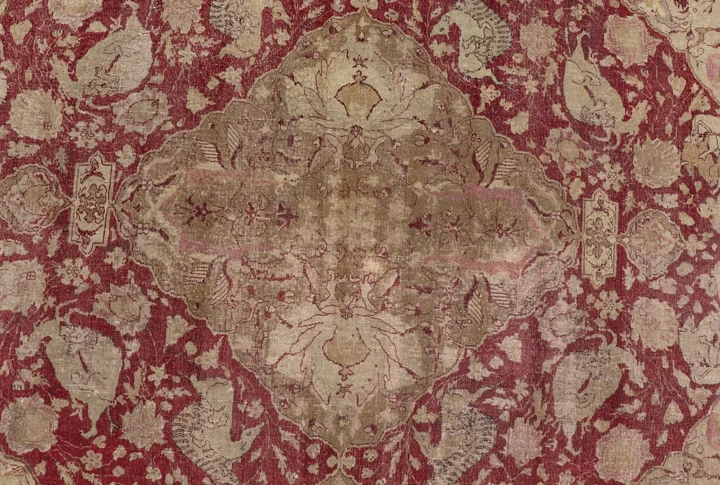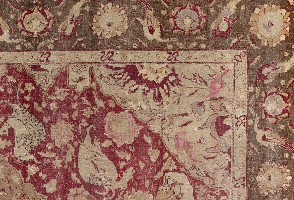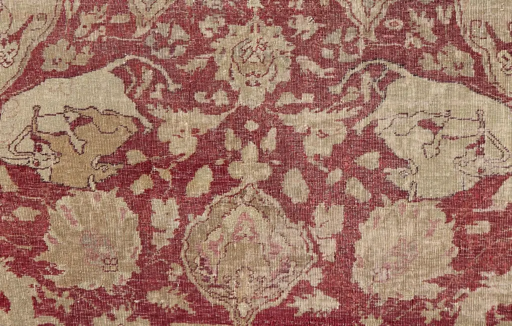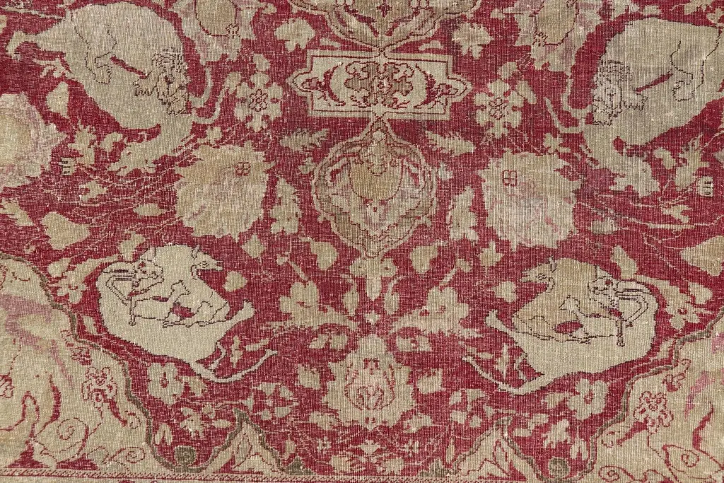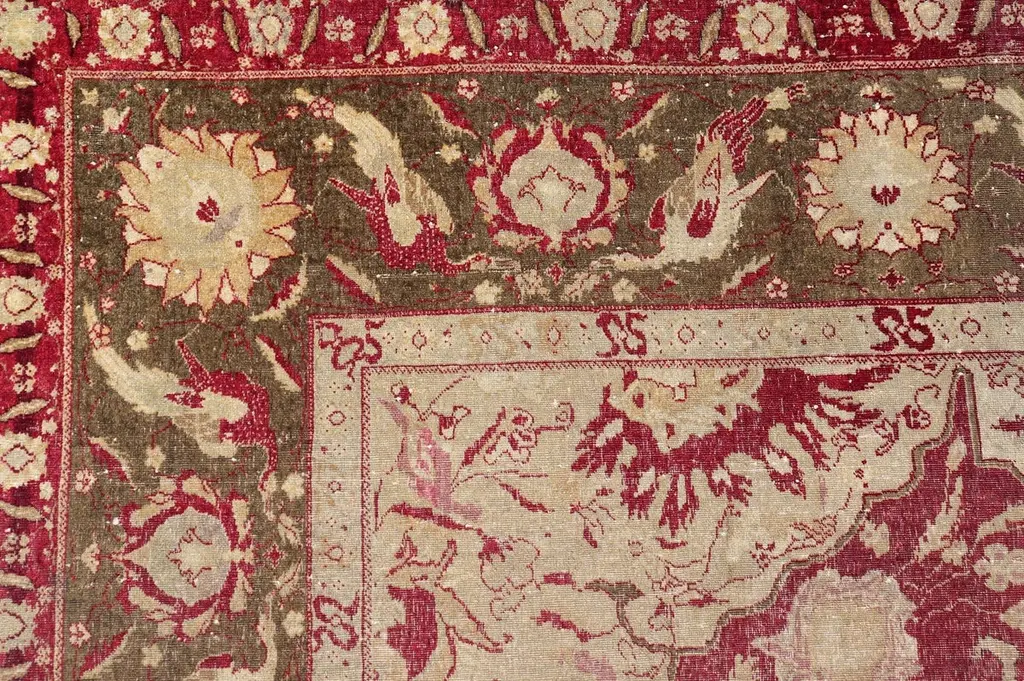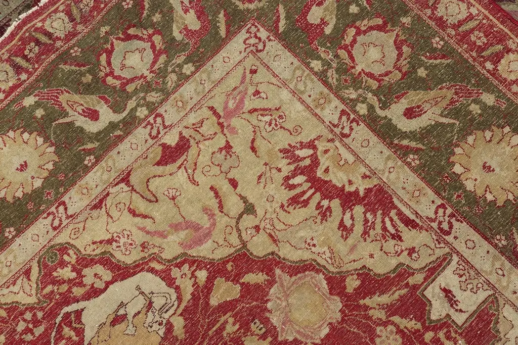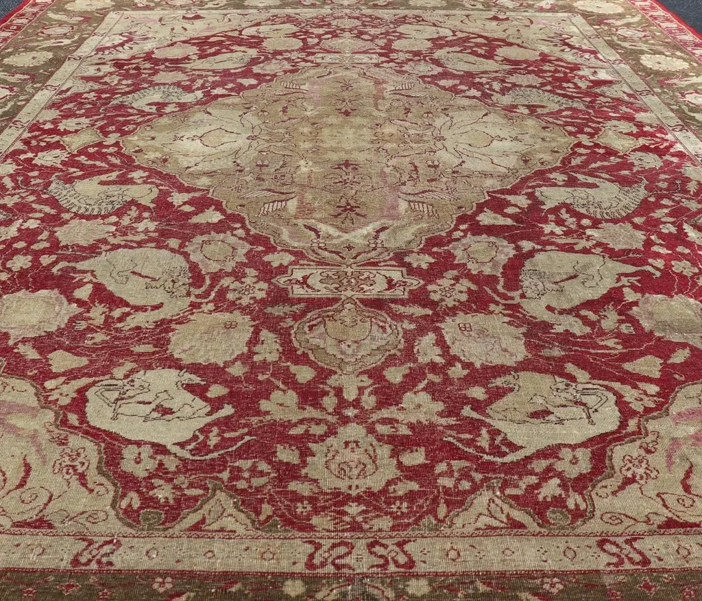 Antique India Agra Rug from the end of Mughal Empire period/ remanent of the Mughal whom ruled most of the Asia. This 18th century Indian rug displays a Central Medallion Design in wine Red, Green, Camel and Tan. Keivan Woven Arts / rug X23-0304, late 18th century Indian Agra.Measures: 5'11 x 7'7 This magnificent antique Agra rug, circa 1790, features a striking central medallion design in soft camel/light brown, surrounded by an intricately detailed wine red field adorned with florals, hunting scene and vine motifs. The deep green border is filled with rosettes and floral patterns, framed by a series of delicate guard borders. Handwoven in India using high-quality wool, this rug has low pile and shows wear. The exquisite craftsmanship and the old age, makes this antique rug a rare and timeless piece that would elevate any room.