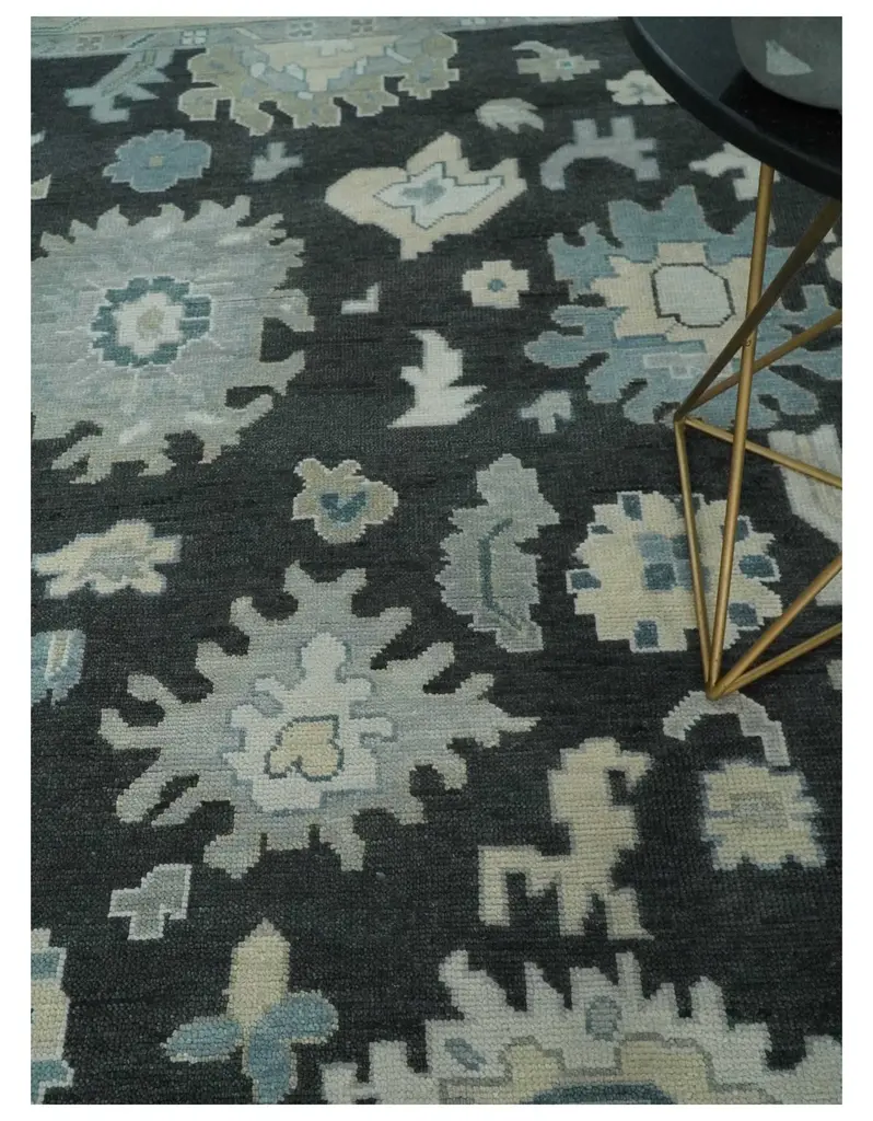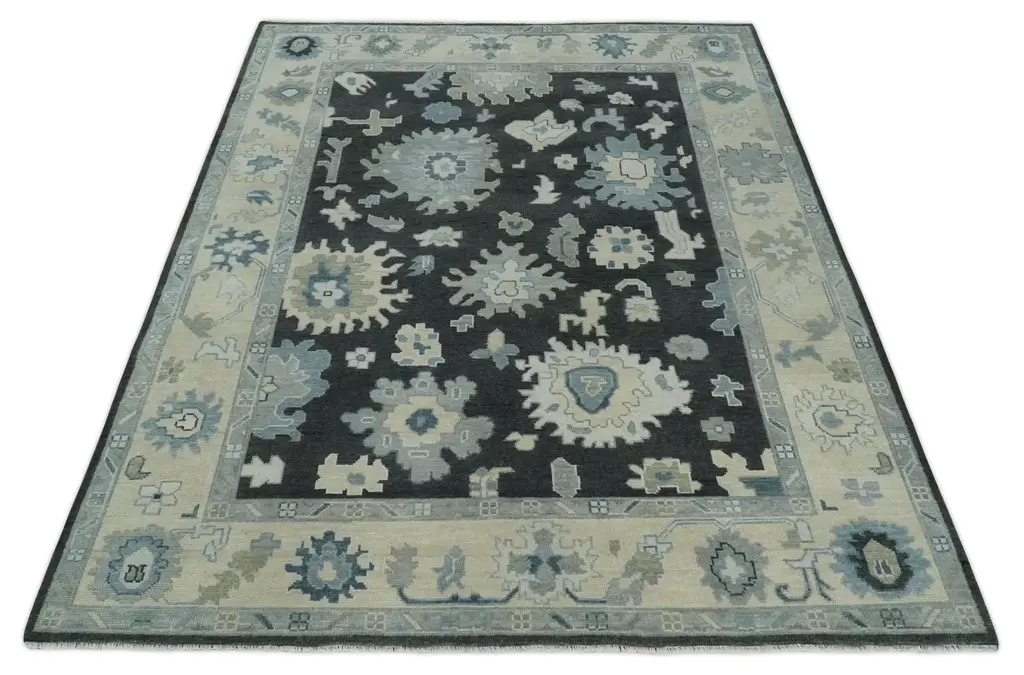 This traditional hand-knotted 8x10, 9x12, and 10x14 Oushak wool rug features a timeless black, beige, and silver color palette and antiques design. Its luxurious wool material provides durability and comfort, making it an elegant addition to any room. Hand-Knotted SIZES ARE MADE TO ORDER IN 30-45 DAYS Made with Wool Color : Black, Beige, and Silver Made with 28 knots per square inch Oushak rugs have been made for centuries and carry a tradition and art. This specific rug is made in India, in the city of Bhadohi. Bhadohi is one of the biggest rug manufacturing cities. Carpet weaving in the region dates back to the 16th century during the reign of Akbar. The skilled artisans of Bhadohi have been carrying the tradition of rug-making for centuries. USERS GUIDE Avoid prolonged moisture Vacuum regularly and/or shake to remove dust Do not pull any loose threads. Use scissors to simply cut the ends The blot spills immediately with a white cloth. Harsh chemicals may damage or fade the rug Use rug protectors under heavy furniture
