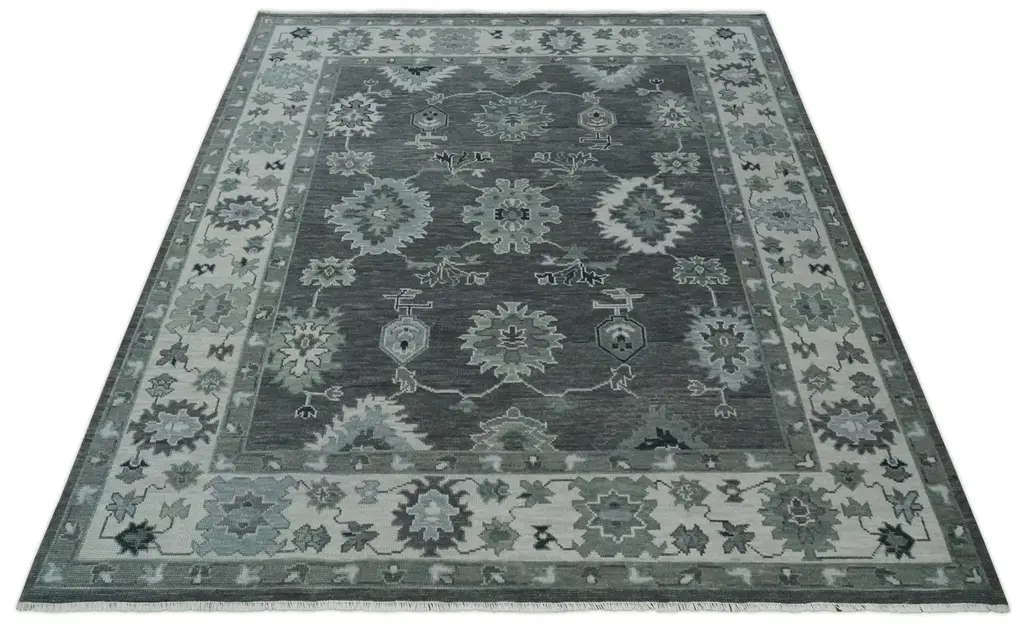 Antique Look Charcoal, Ivory And Silver Hand Knotted Traditional Oushak Custom Made Wool Area Rug - 2.6x6