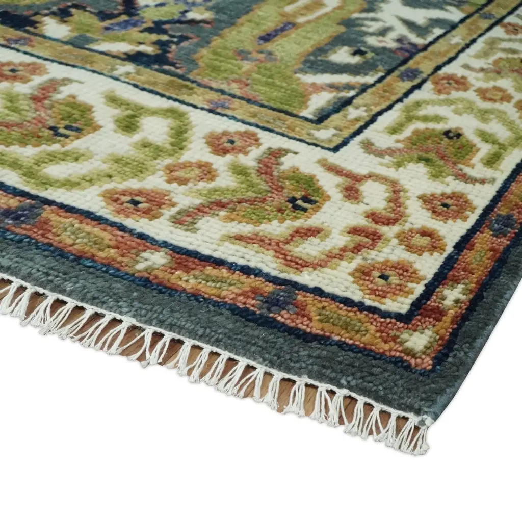 This Hand-Knotted Rug has been Made with Handspun Wool. The beautiful colors and design of the rug carry a legacy of Oushak rugs. The large design of the rug completes your space without making it look busy. The rug is durable and can last for decades if treated right. Hand-Knotted ALL SIZES ARE MADE TO ORDER IN 30-45 DAYS Made with Soft Wool Color: Green, Ivory and Gray Made with 22 knots per square inch This specific rug is made in India, in the city of Bhadohi. Bhadohi is one of the biggest rug manufacturing cities. Carpet weaving in the region dates back to the 16th century during the reign of Akbar. The skilled artisans of Bhadohi have been carrying the tradition of rug-making for centuries. USERS GUIDE Avoid prolonged moisture Vacuum regularly and/or shake to remove dust Do not pull any loose threads. Use scissors to simply cut the ends Blot spills immediately with a white cloth. Harsh chemicals may damage or fade the rug Use rug protectors under heavy furniture