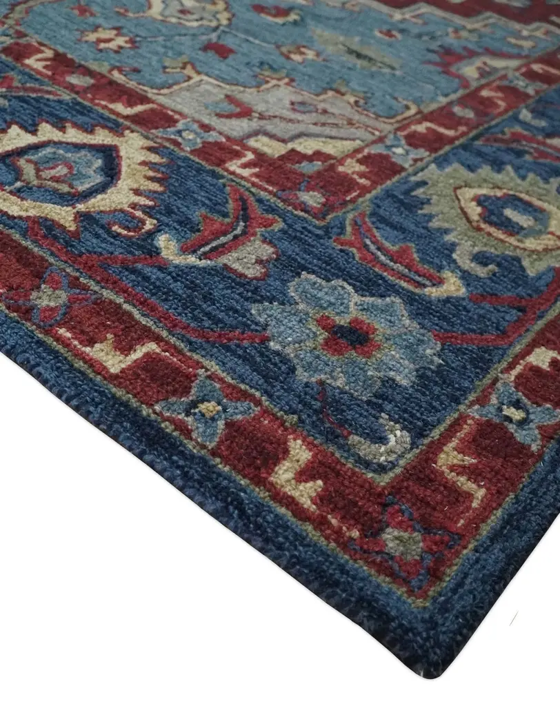 This Hand-Tufted Rug has been Made with Wool. The beautiful colors of the rug carry a legacy of the famous Heriz rug, the traditional design of the rug completes your space without making it look busy. Heriz rugs are durable and can last for decades if treated right. Hand-Tufted Rug Sizes are made to order 30-45 days Made with Wool Loop Pile Color: Maroon and Blue Heriz rugs have been made for centuries and carry a tradition and art. This specific rug is made in India, in the city of Bhadohi. Bhadohi is one of the biggest rug manufacturing cities. Carpet weaving in the region dates back to the 16th century during the reign of Akbar. The skilled artisans of Bhadohi have been carrying the tradition of rug-making for centuries. USERS GUIDE Avoid prolonged moisture Vacuum regularly and/or shake to remove dust Do not pull any loose threads. Use scissors to simply cut the ends The blot spills immediately with a white cloth. Harsh chemicals may damage or fade the rug Use rug protectors under heavy furniture