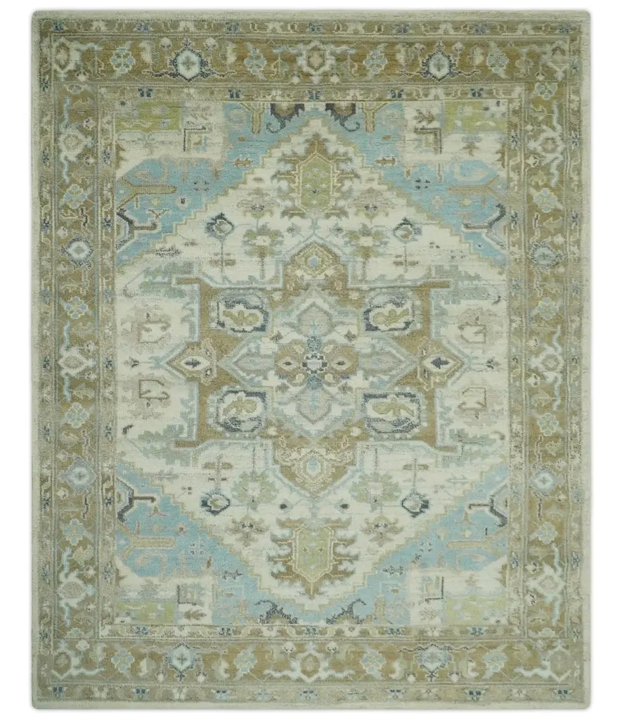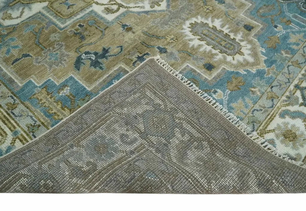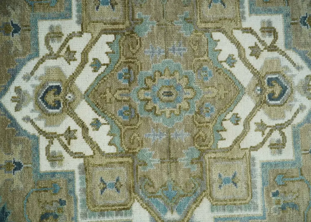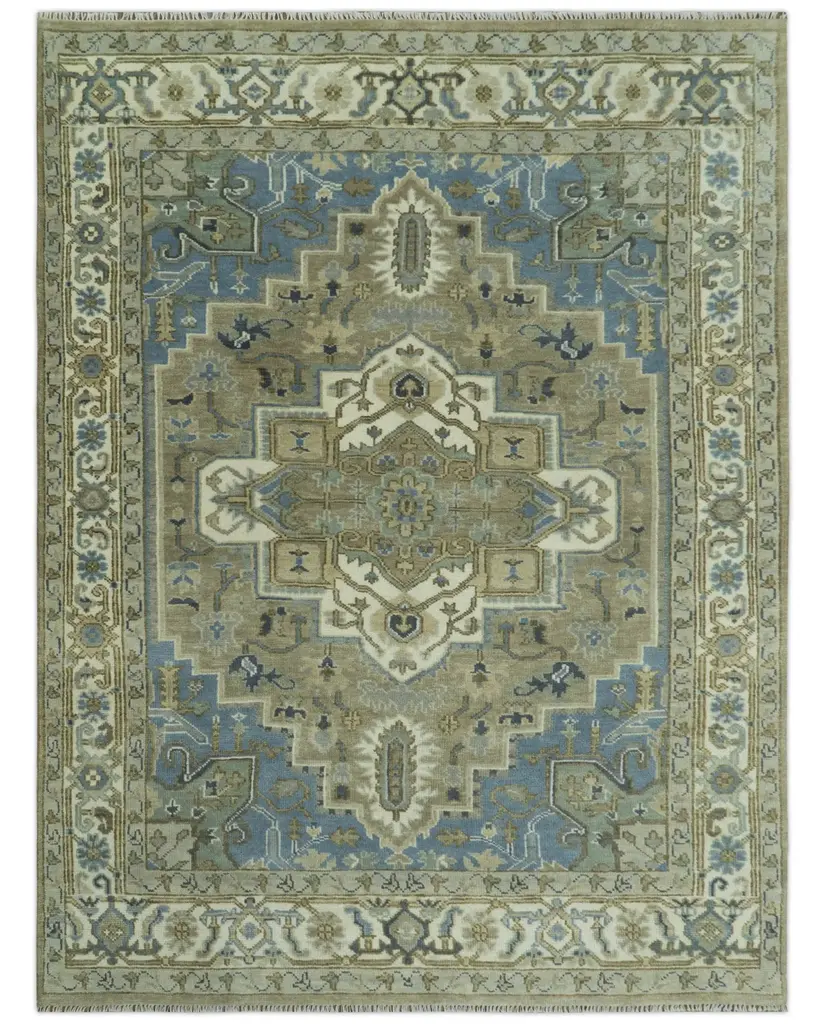 This Hand-Knotted Rug has been Made with Handspun Wool. The beautiful colors of the rug carry a legacy of the famous Heriz rug, the traditional design of the rug completes your space without making it look busy. Hand-Knotted rugs are durable and can last for decades if treated right. Hand-Knotted Rug Made with Wool Color: Olive, Blue and Ivory Made with 22 knots per square inch ALL SIZES ARE MADE TO ORDER IN 30-45 Days This specific rug is made in India, in the city of Bhadohi. Bhadohi is one of the biggest rug manufacturing cities. Carpet weaving in the region dates back to the 16th century during the reign of Akbar. The skilled artisans of Bhadohi have been carrying the tradition of rug-making for centuries. USERS GUIDE Avoid prolonged moisture Vacuum regularly and/or shake to remove dust Do not pull any loose threads. Use scissors to simply cut the ends Blot spills immediately with a white cloth. Harsh chemicals may damage or fade the rug Use rug protectors under heavy furniture