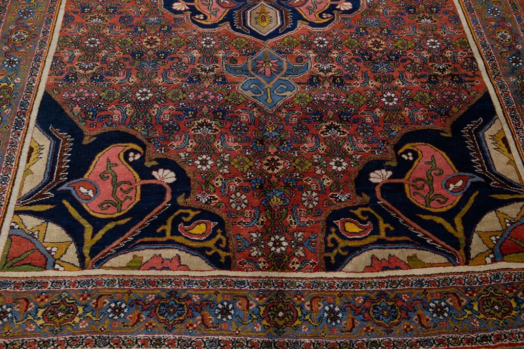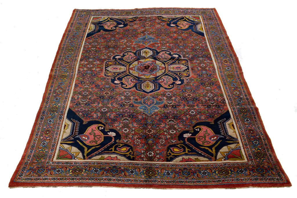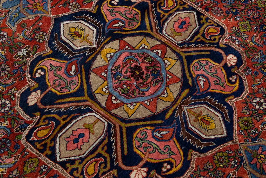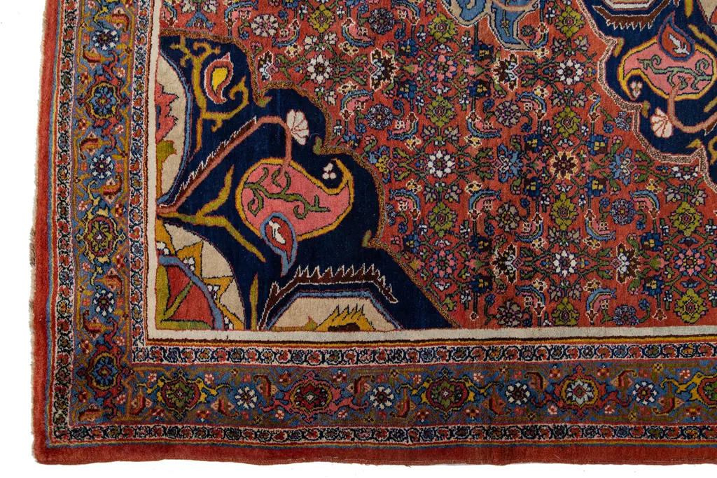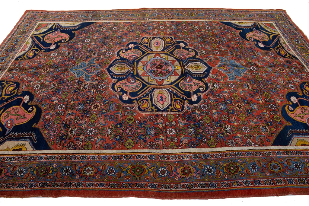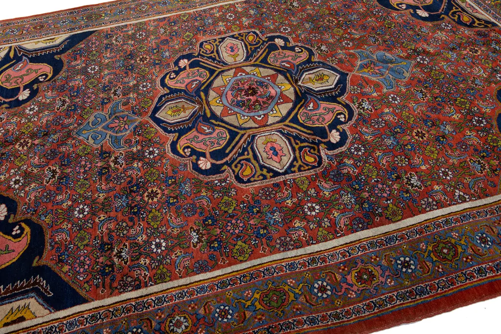 Beautiful antique Bidjar hand-knotted wool rug with a red color field. This Persian rug has a blue frame with multicolor accents in a gorgeous all-over traditional floral design. This rug measures 7'5" x 10'10". Our Rugs are professionally cleaned before shipping.