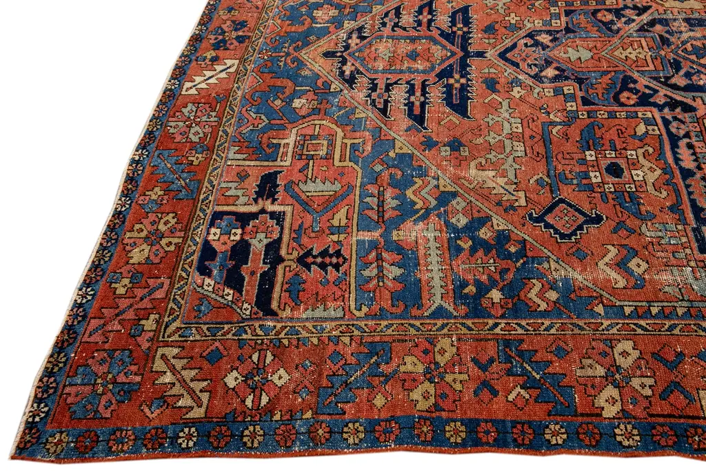 Beautiful antique Heriz hand-knotted wool rug with a rust field. This Persian rug has navy-blue, brown, and beige accents in a gorgeous all-over geometric medallion floral motif. This rug measures: 9' x 12'7". Our Rugs are professionally cleaned before shipping.