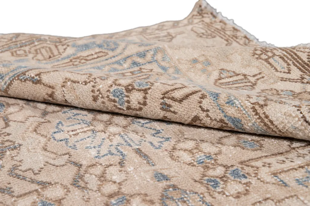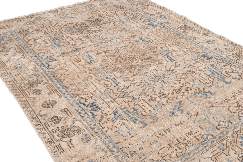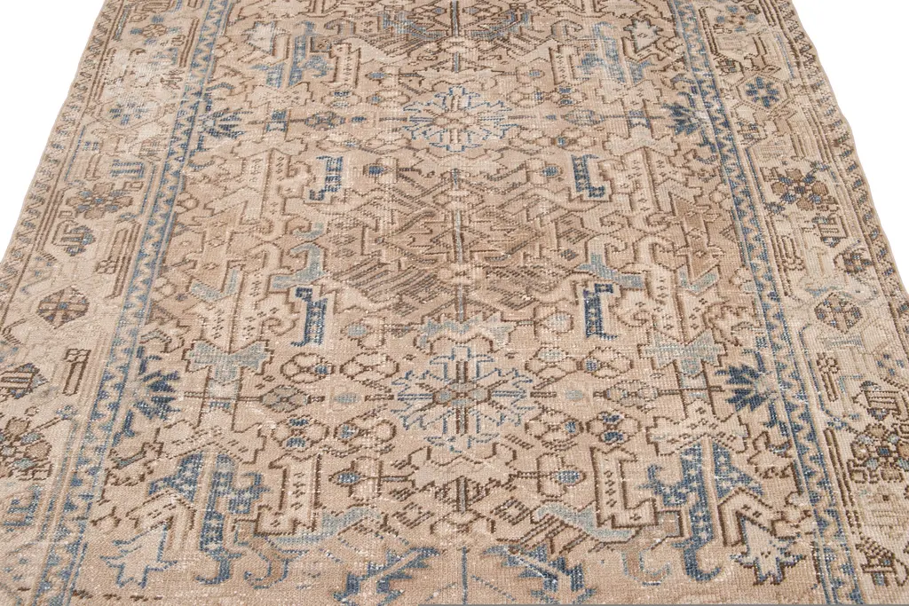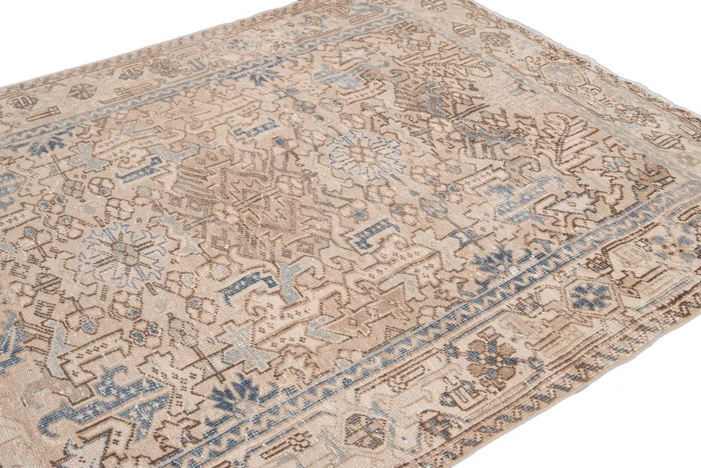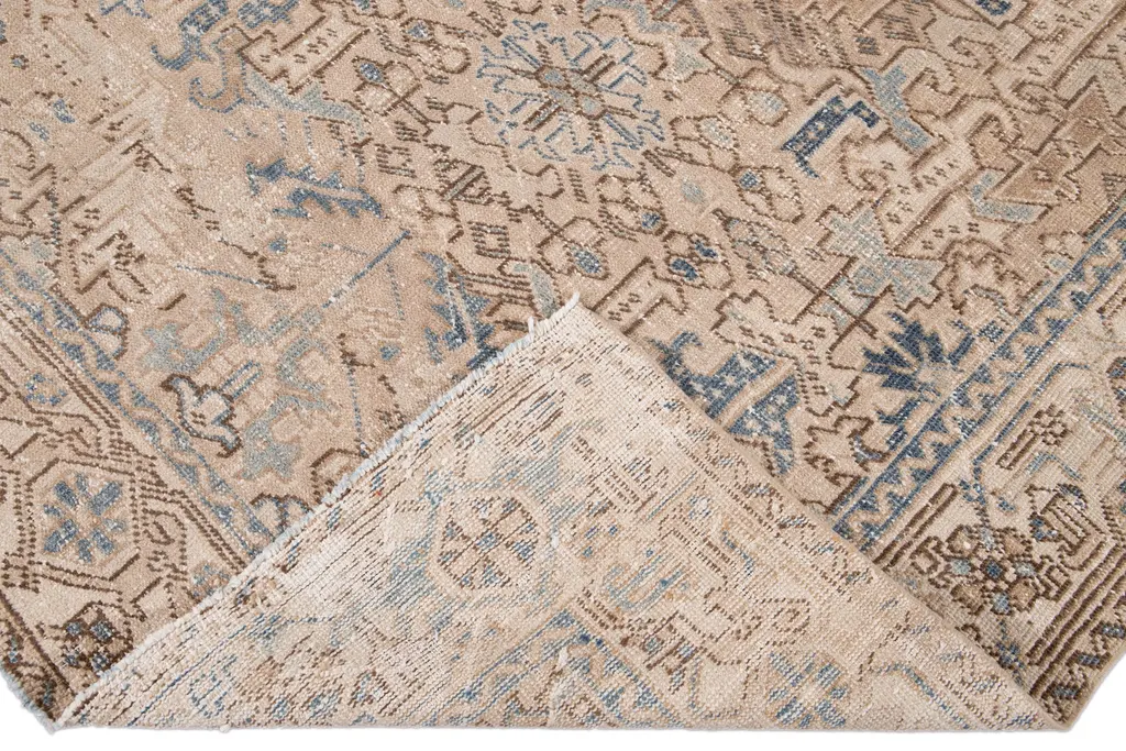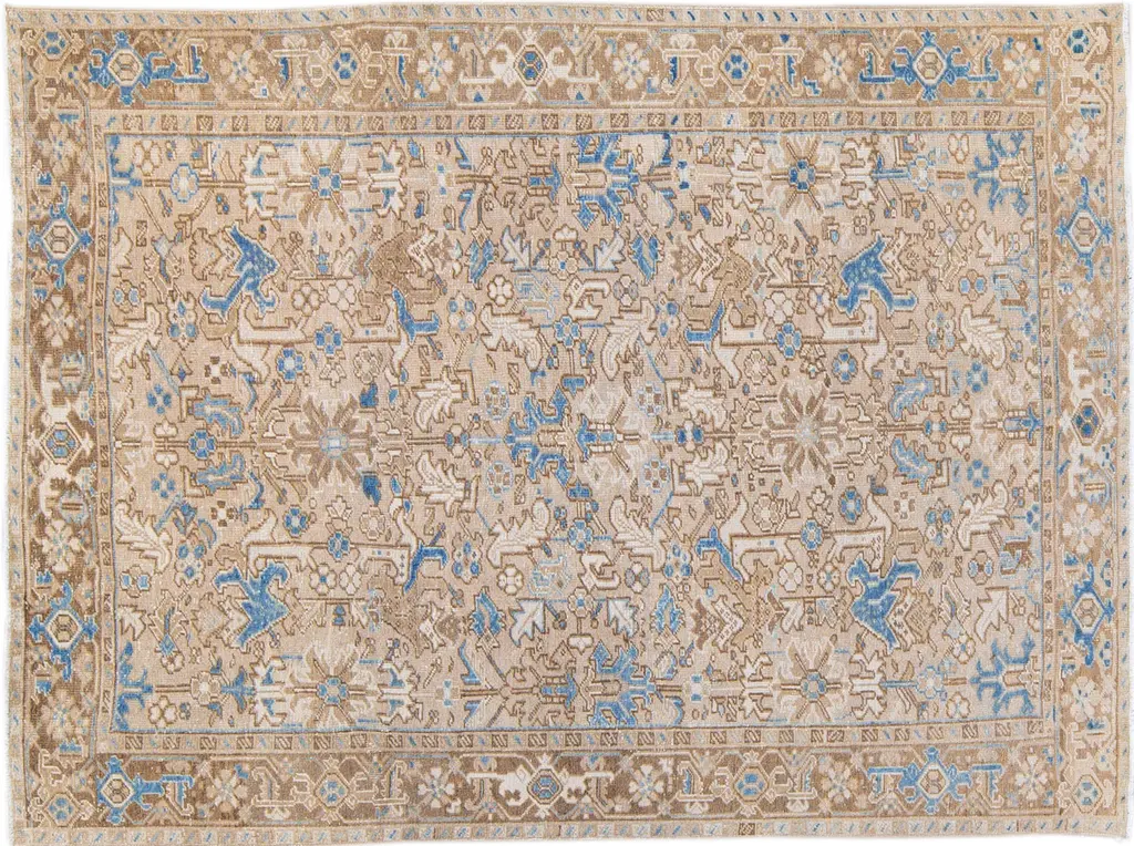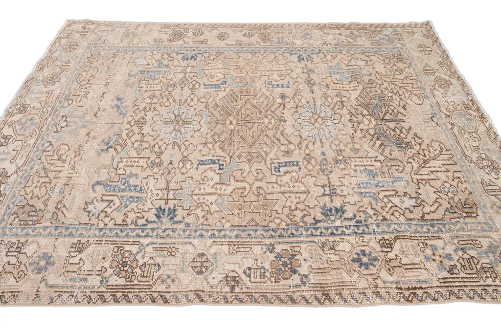 Beautiful antique Persian Heriz hand knotted wool rug with a beige field. This Heriz rug has a blue and brown frame and accents in an all-over gorgeous geometric floral shabby chic design. This rug measures: 6' x 8'2". Our Rugs are professionally cleaned before shipping.