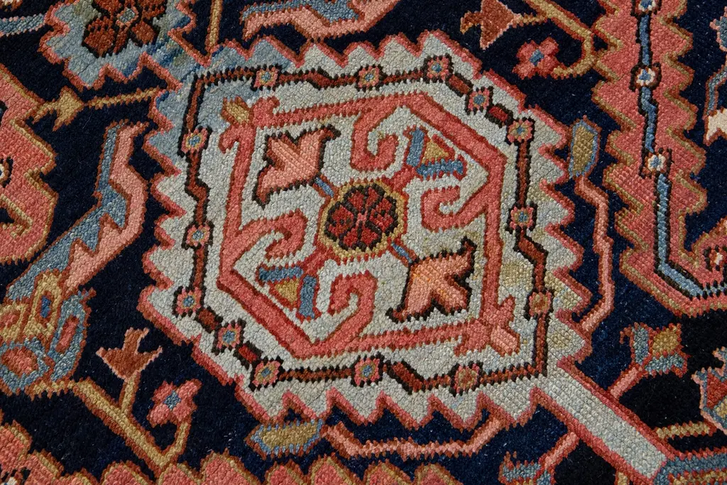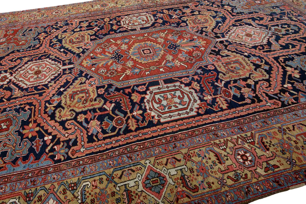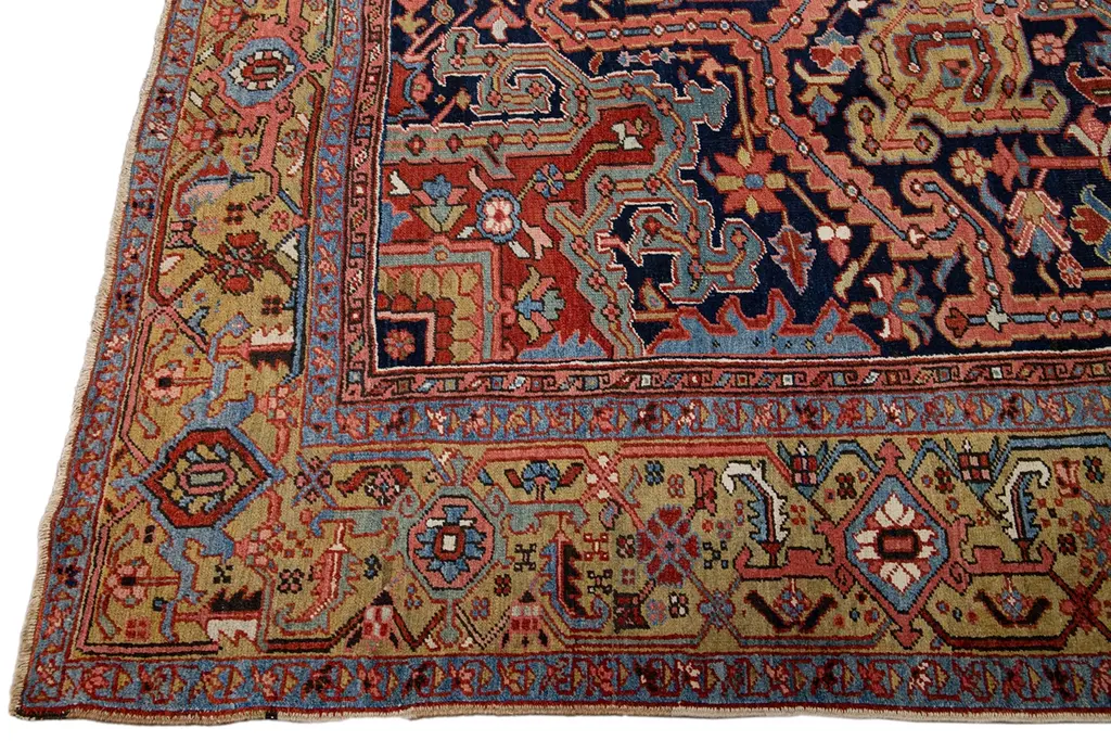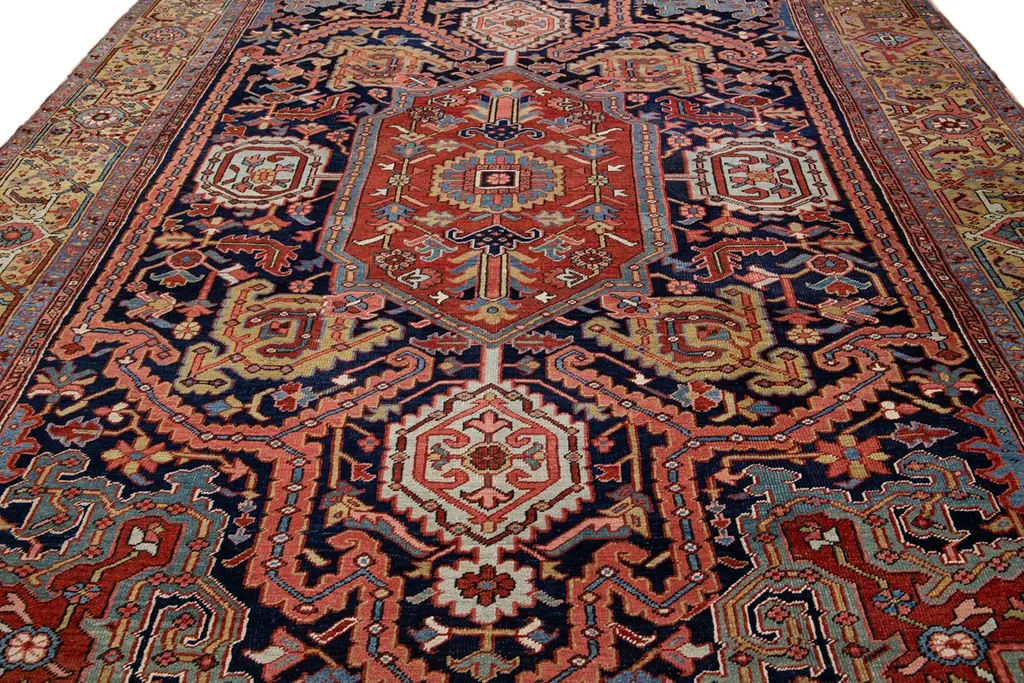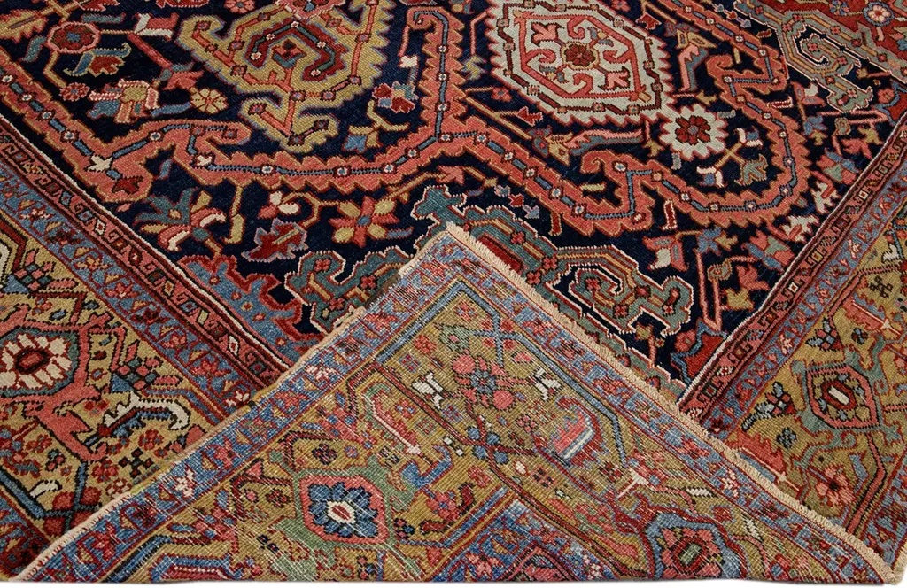 Beautiful Antique Heriz hand-knotted wool rug with a navy-blue and rust field. This Heriz rug has a tan frame and multicolor accents in a gorgeous all-over geometric medallion floral design. This rug measures: 9'9" x 13'6". Our Rugs are professionally cleaned before shipping.