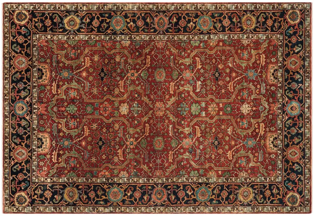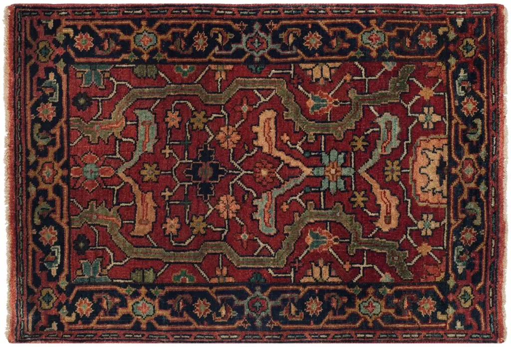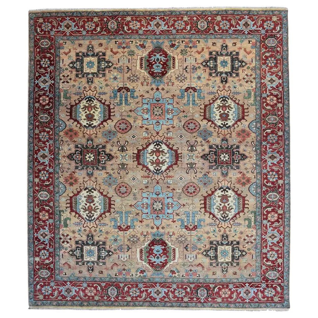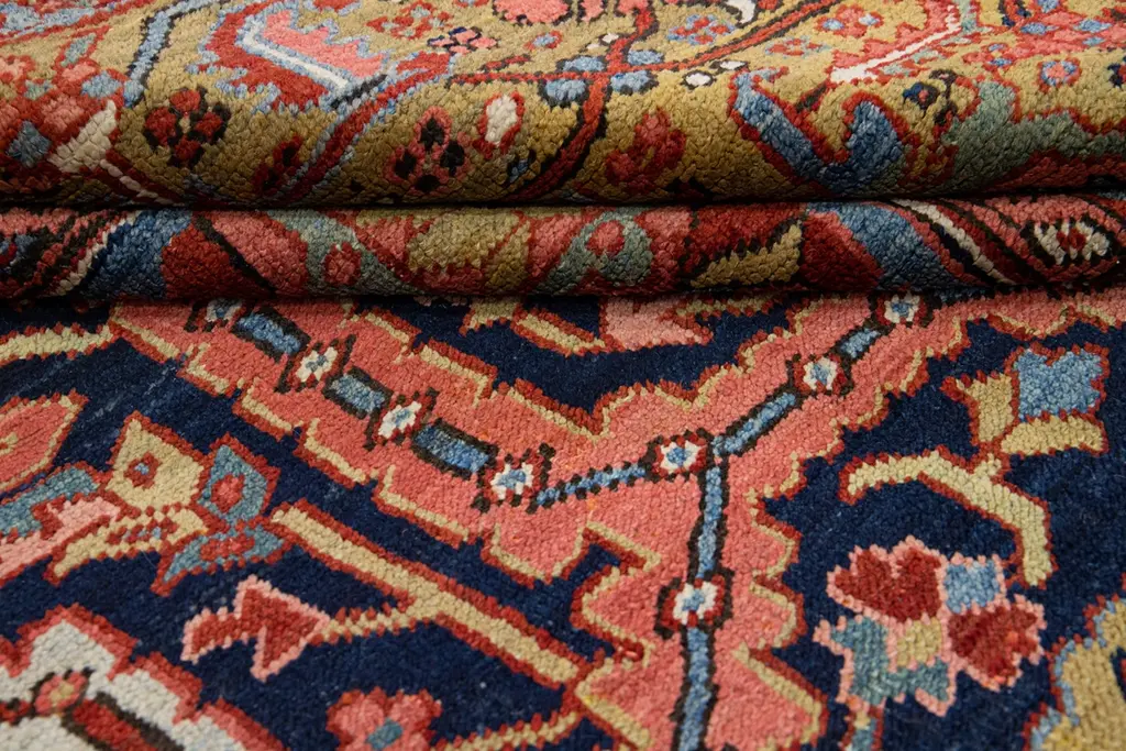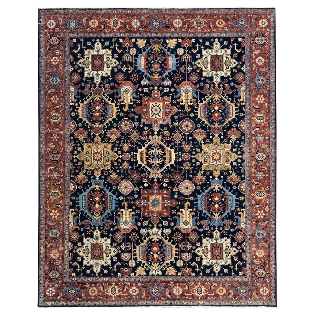 Beautiful Antique Heriz hand-knotted wool rug with a navy-blue and rust field. This Heriz rug has a tan frame and multicolor accents in a gorgeous all-over geometric medallion floral design. This rug measures: 9'9" x 13'6". Our Rugs are professionally cleaned before shipping.