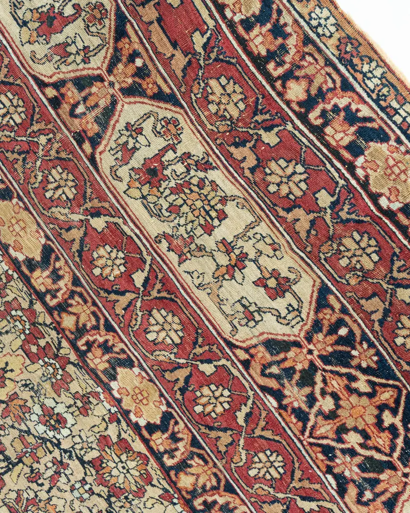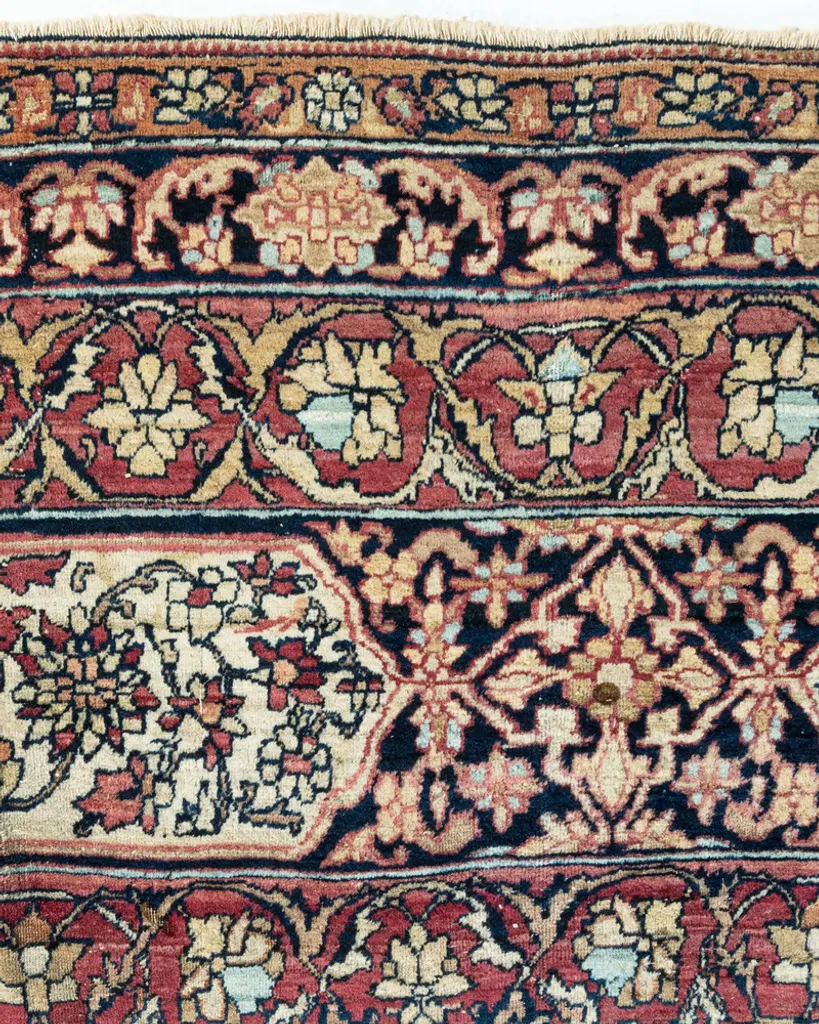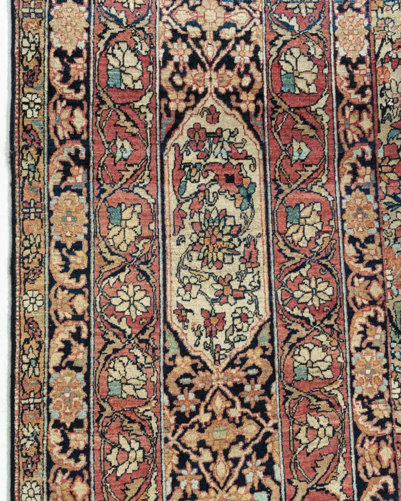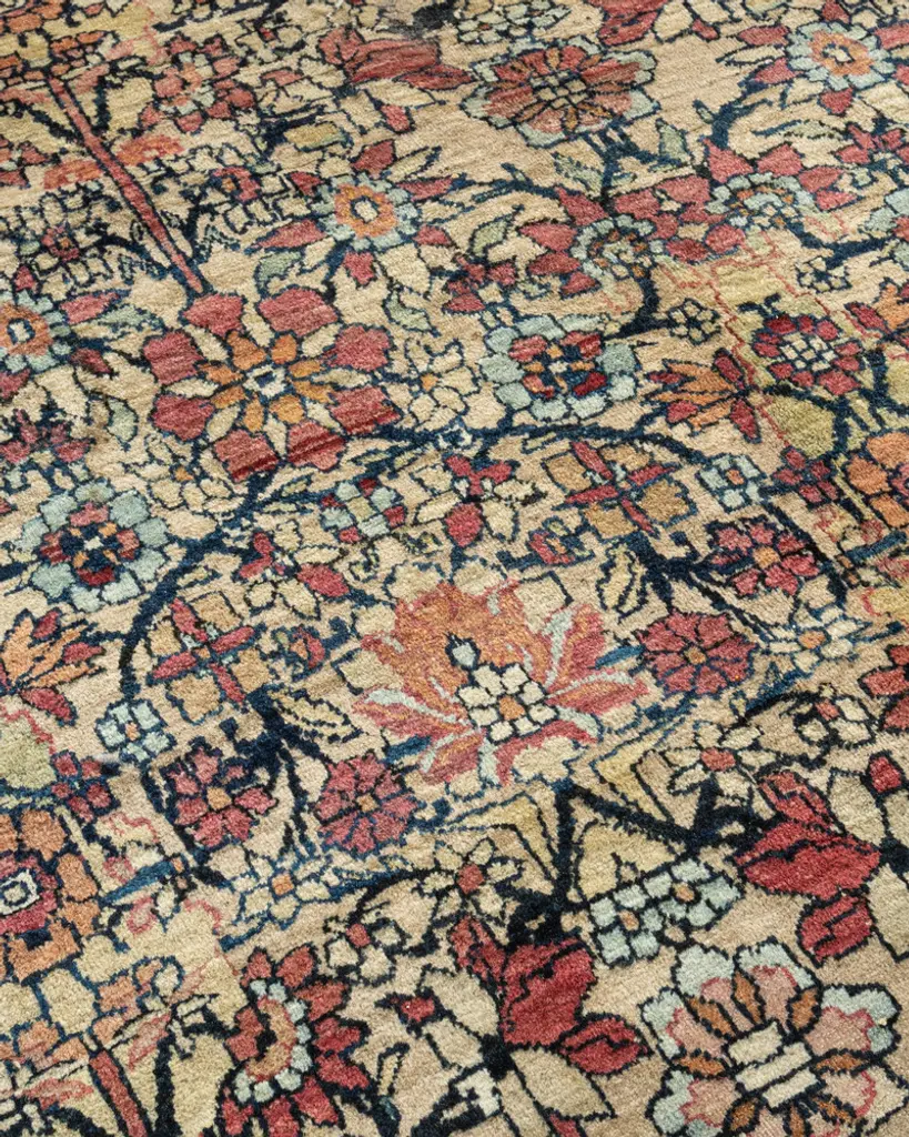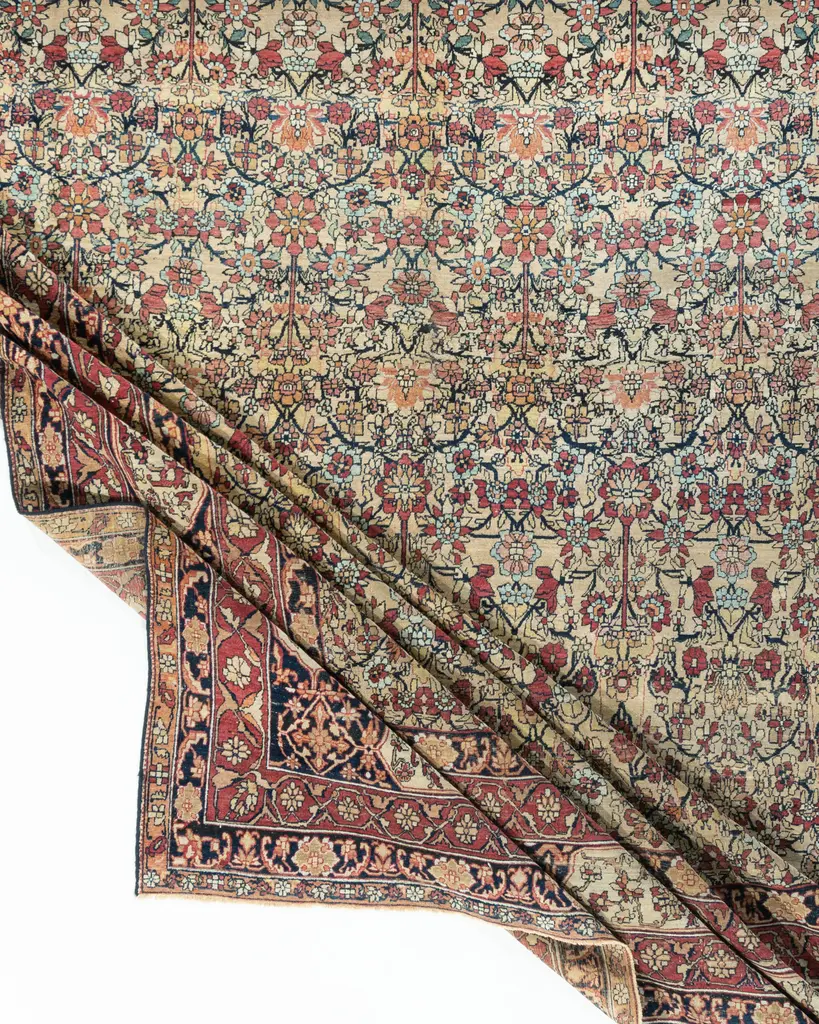 This large Antique Persian Kirman rug circa 1900 is truly a work of art. The main ground filled to profusion with finely detailed floral images is enclosed by a plethora of borders, the main border in a combination of navy and ivory enclosed by five guard borders to create a wide surround to the main field and give a powerful impression of beauty and fine taste. Colors: camel/navy/raspberry red/ivory/pale blue.