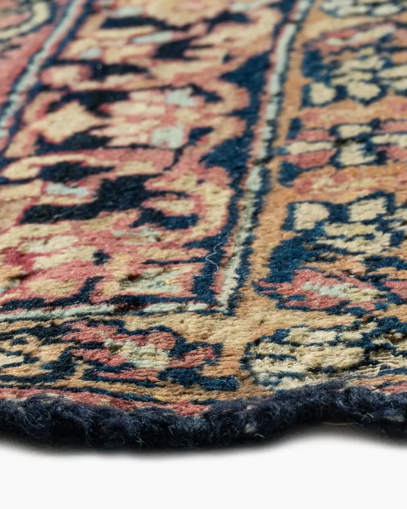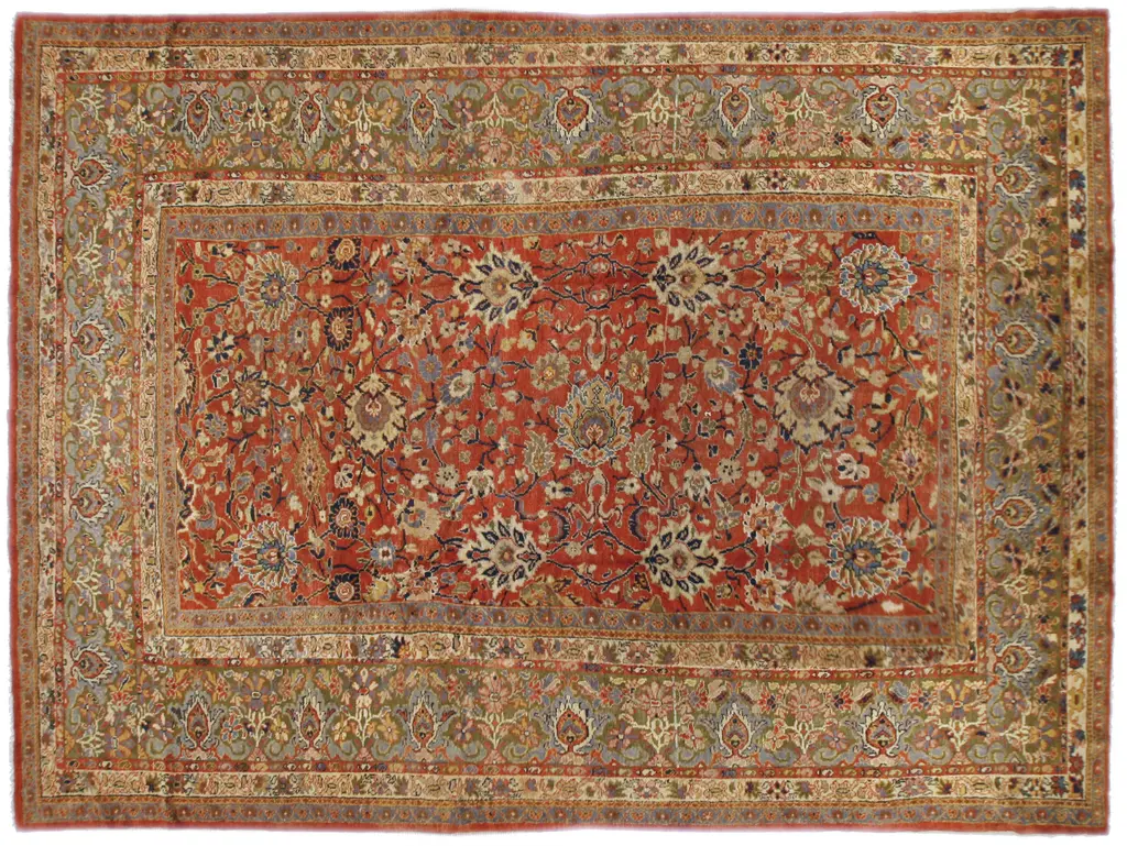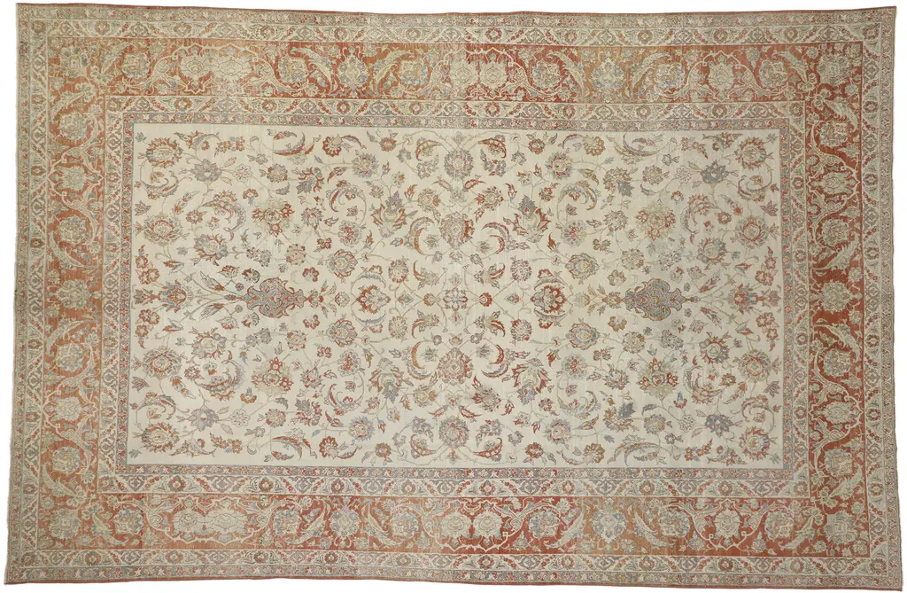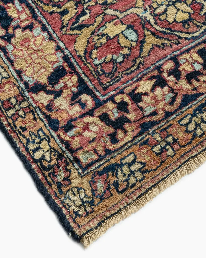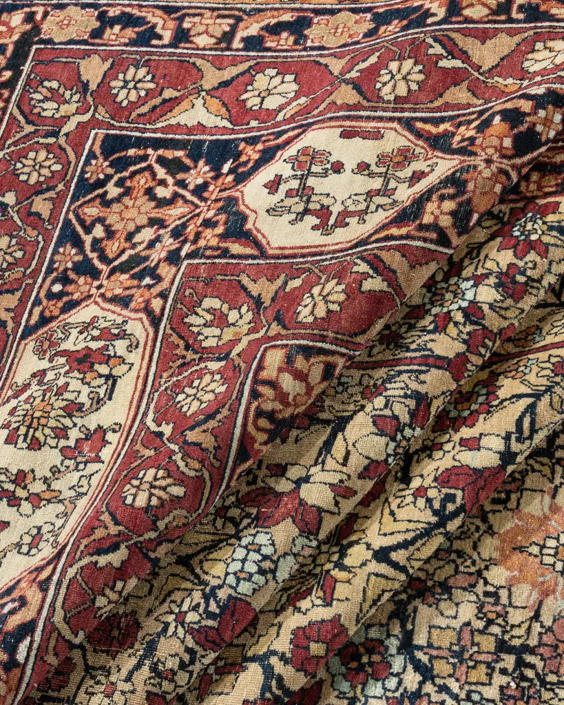 This large Antique Persian Kirman rug circa 1900 is truly a work of art. The main ground filled to profusion with finely detailed floral images is enclosed by a plethora of borders, the main border in a combination of navy and ivory enclosed by five guard borders to create a wide surround to the main field and give a powerful impression of beauty and fine taste. Colors: camel/navy/raspberry red/ivory/pale blue.